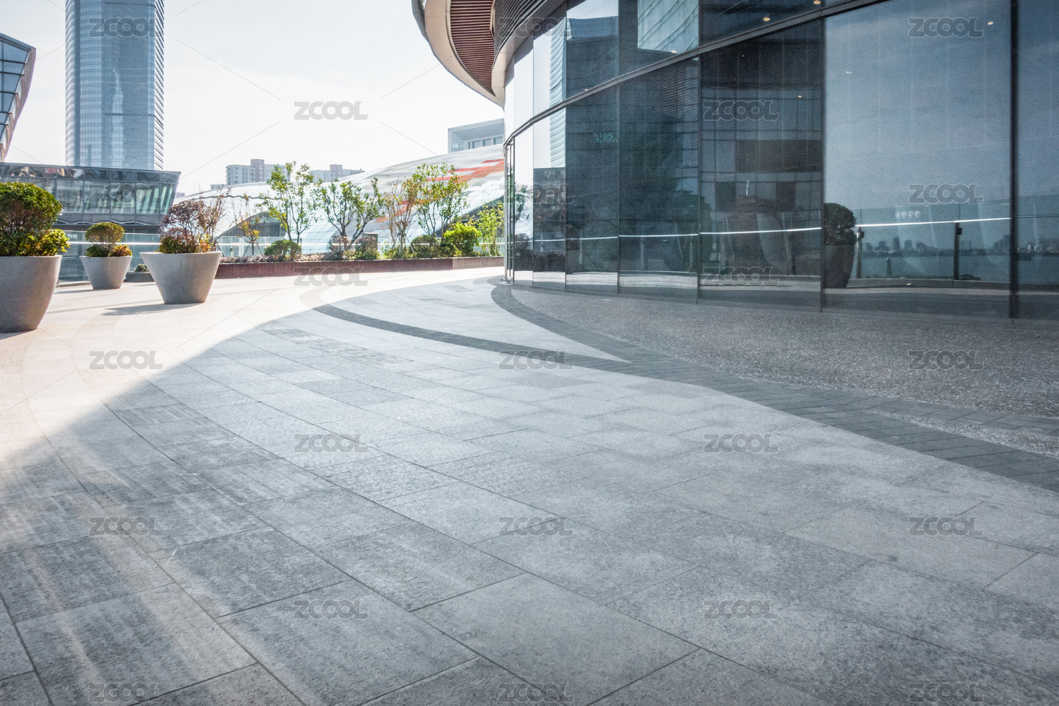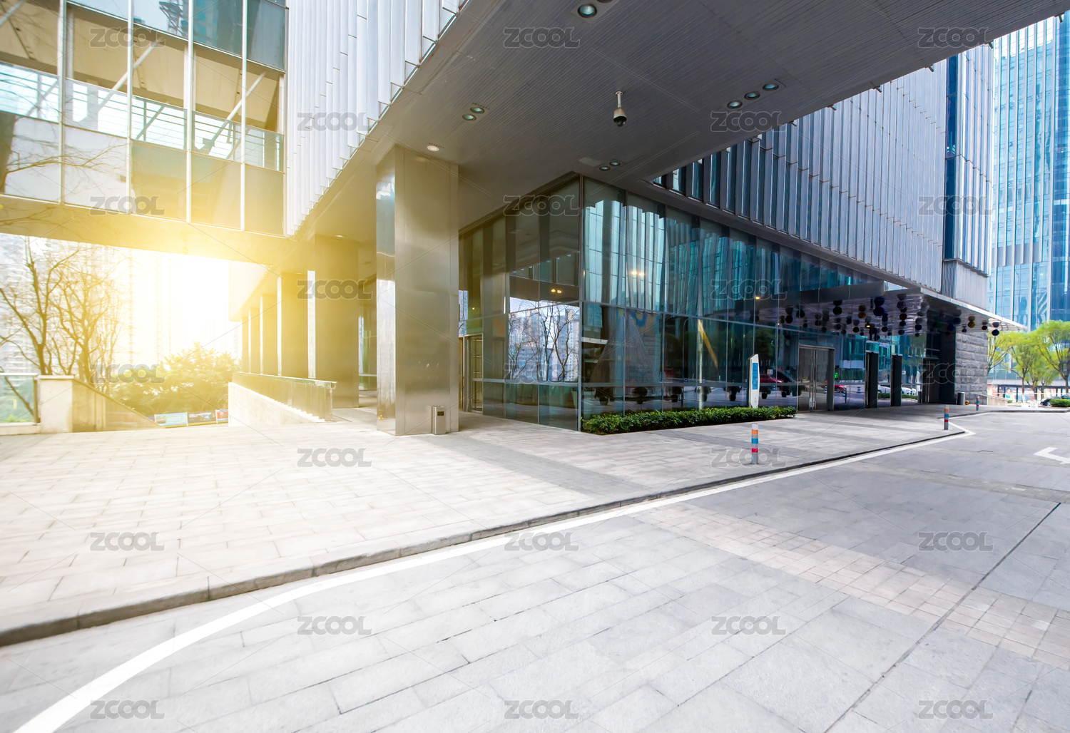 无人现代商业建筑局部与地面