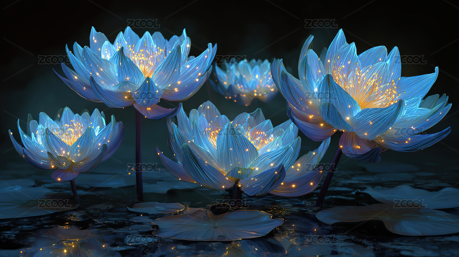 发光的蓝色莲花在水中绽放