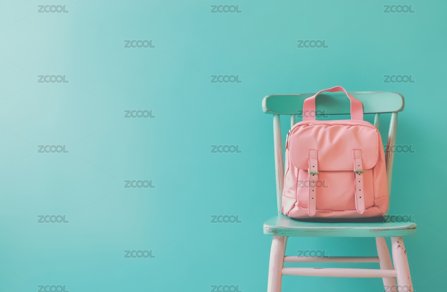 一个背包挂在一把淡绿色的椅子上