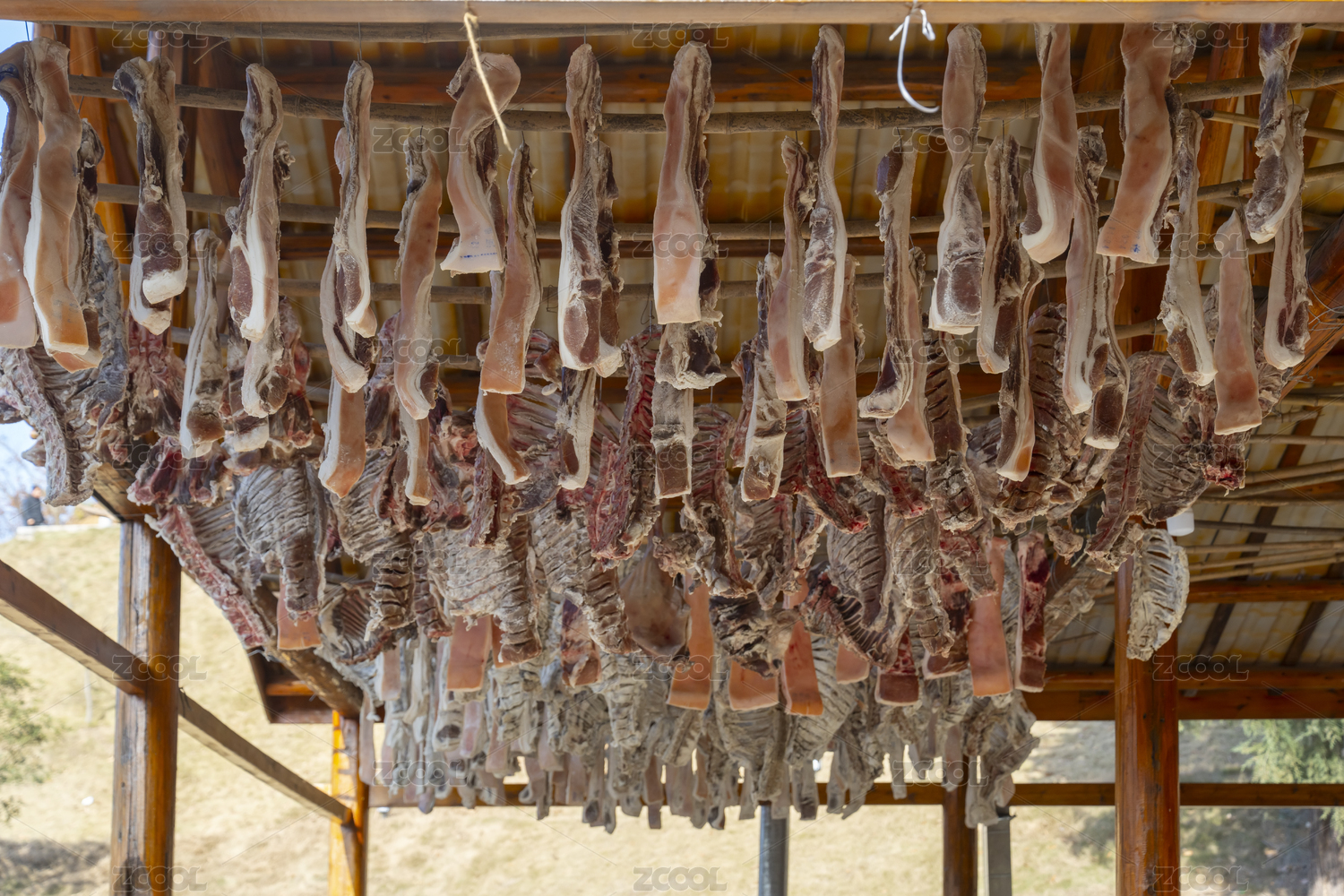 中国安徽省黄山市木梨硔村民晾晒火腿竹笋