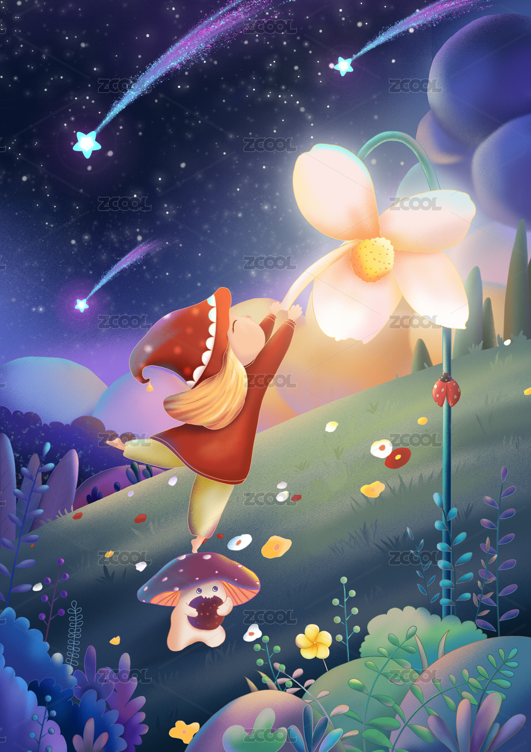 可爱治愈夜晚的小精灵儿童插画