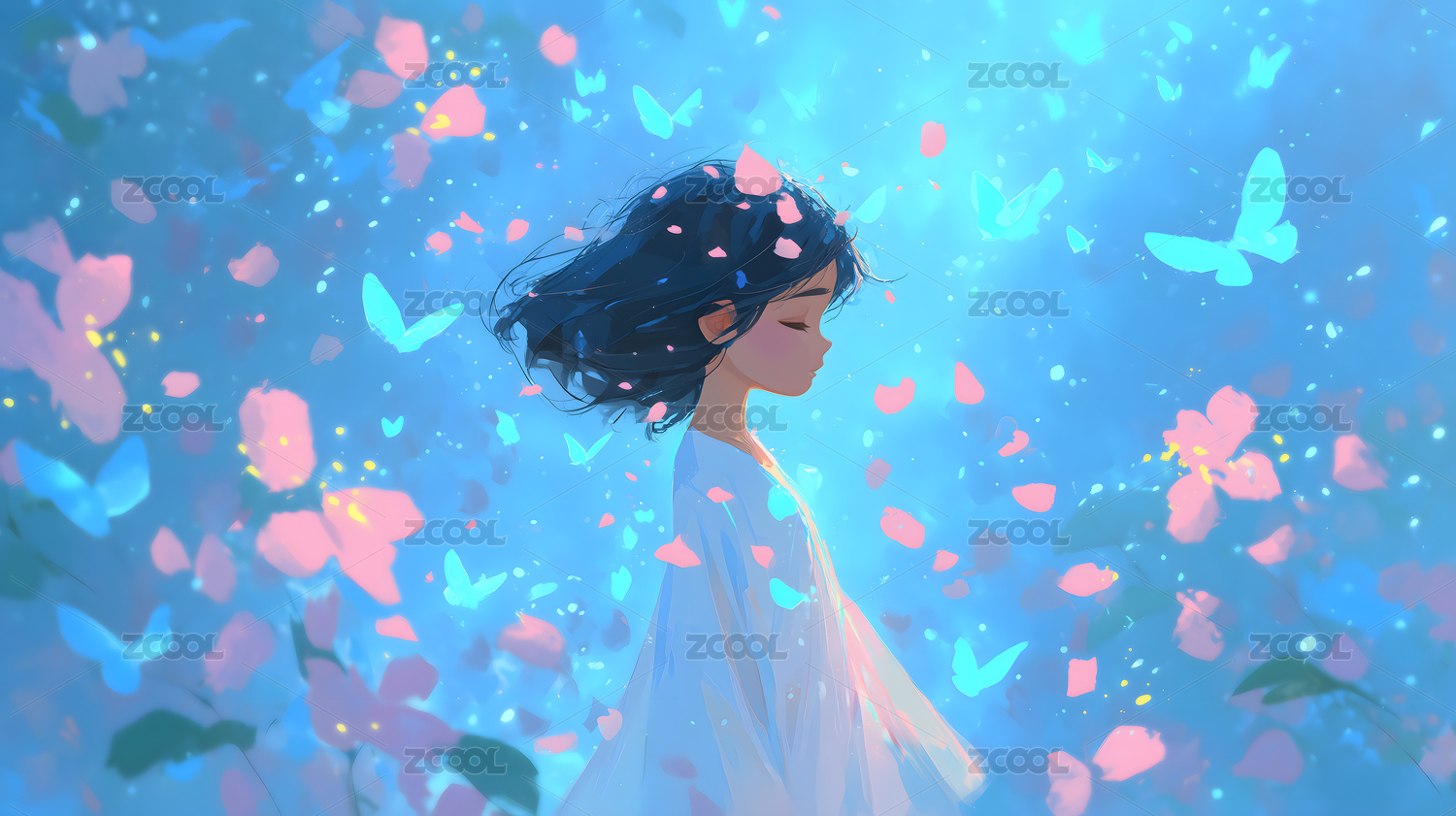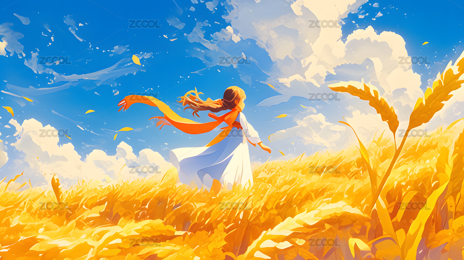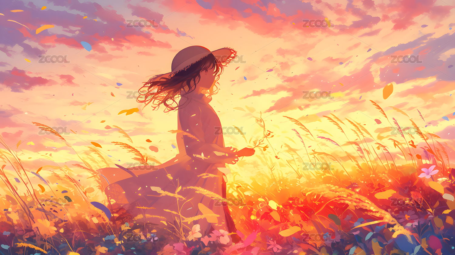 女孩,花海,花丛,暖调,阳光,童话,插画,温馨,跳舞