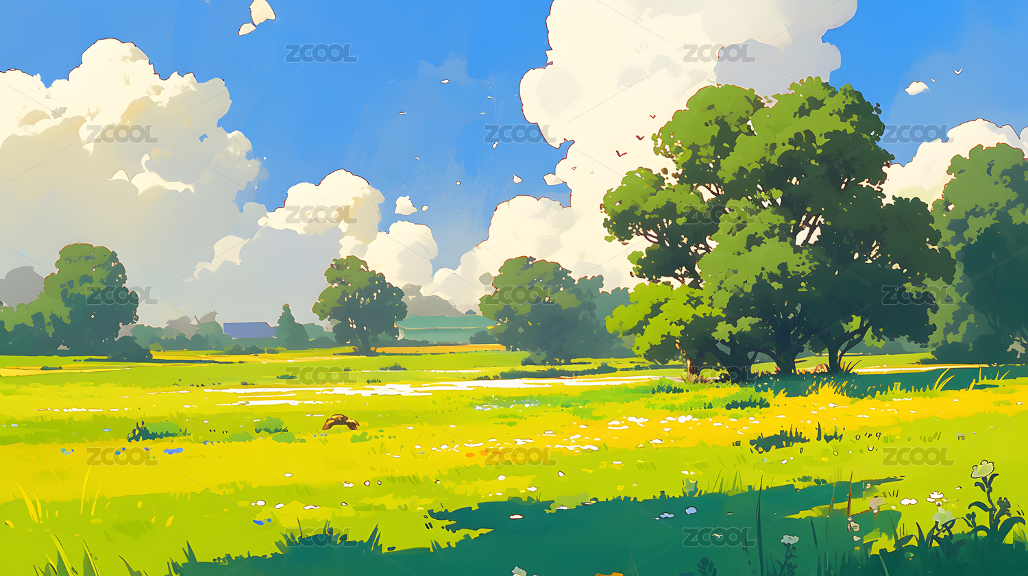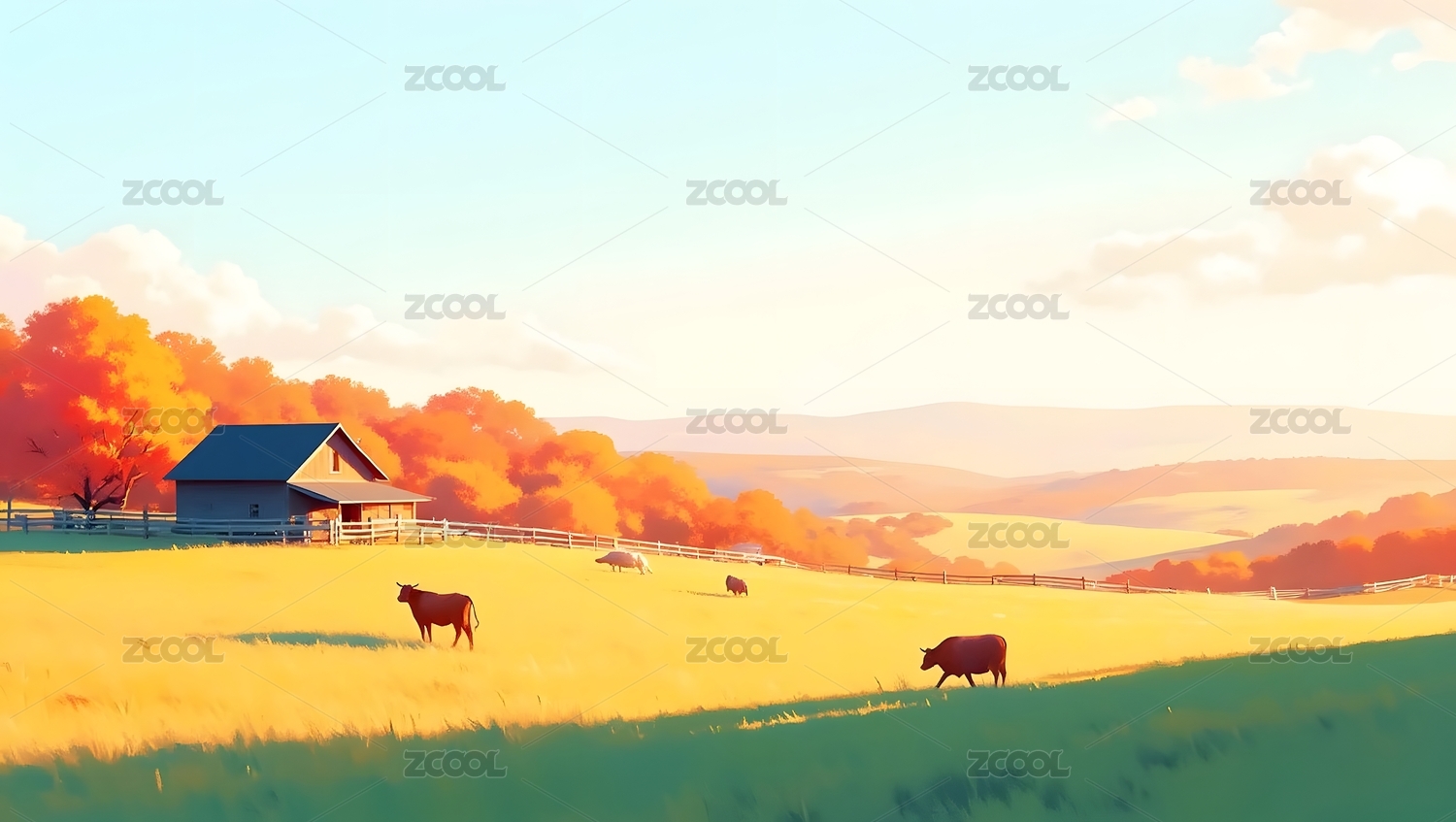 牧场,草原,草地,夏天,牛,奶牛,家畜,放牧,畜牧业,水彩
