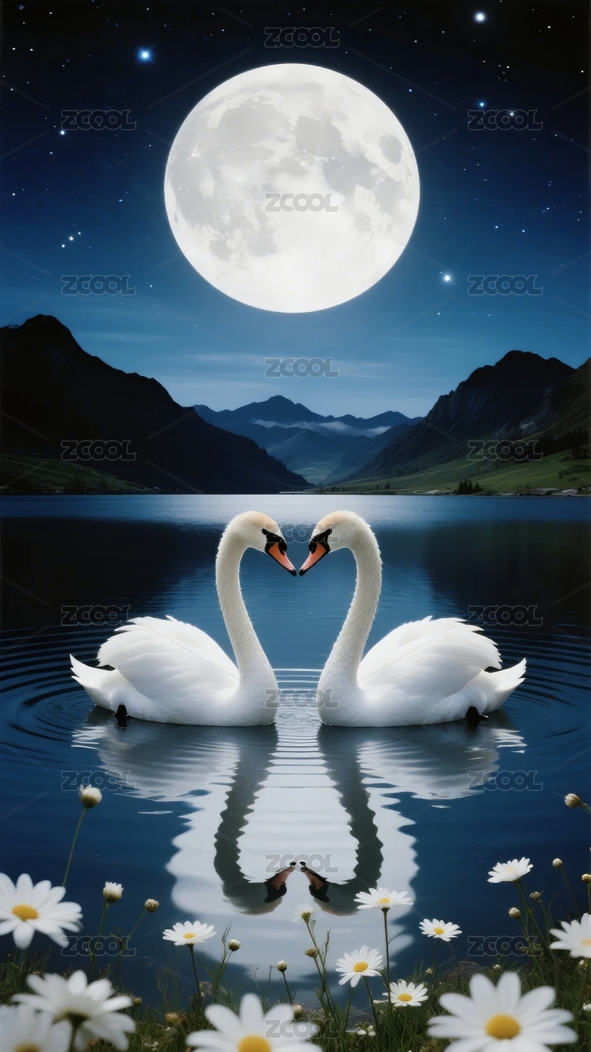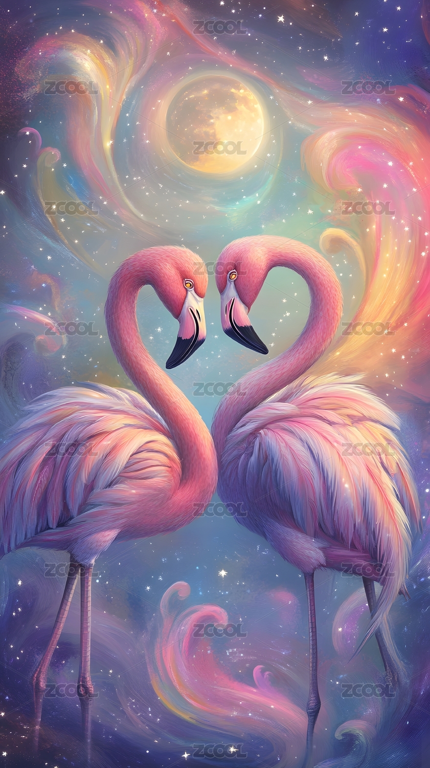 心形交颈天鹅相依相偎,粉色浪漫星空唯美