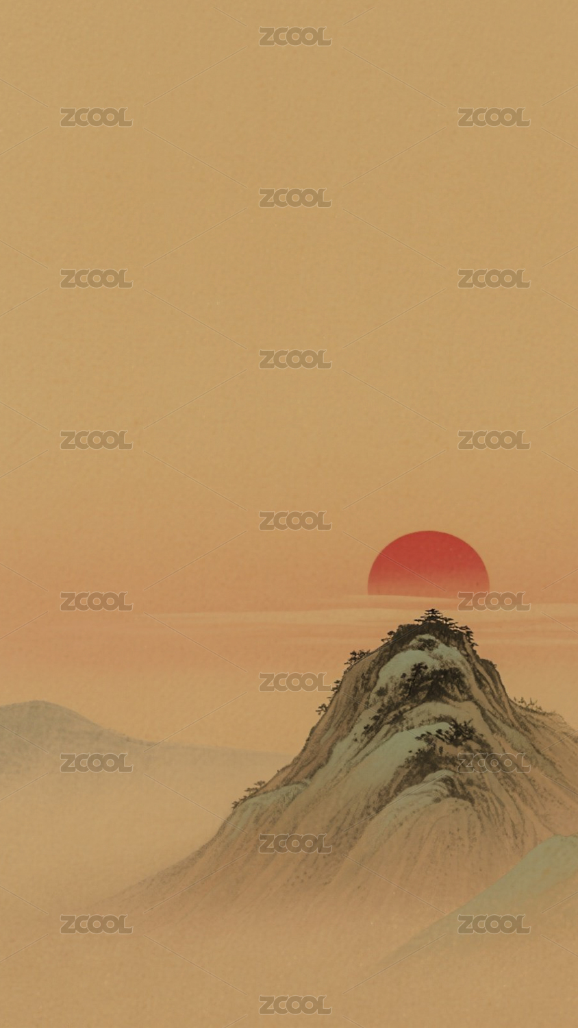 手绘艺术唯美的太阳下的日本富士山风景复古