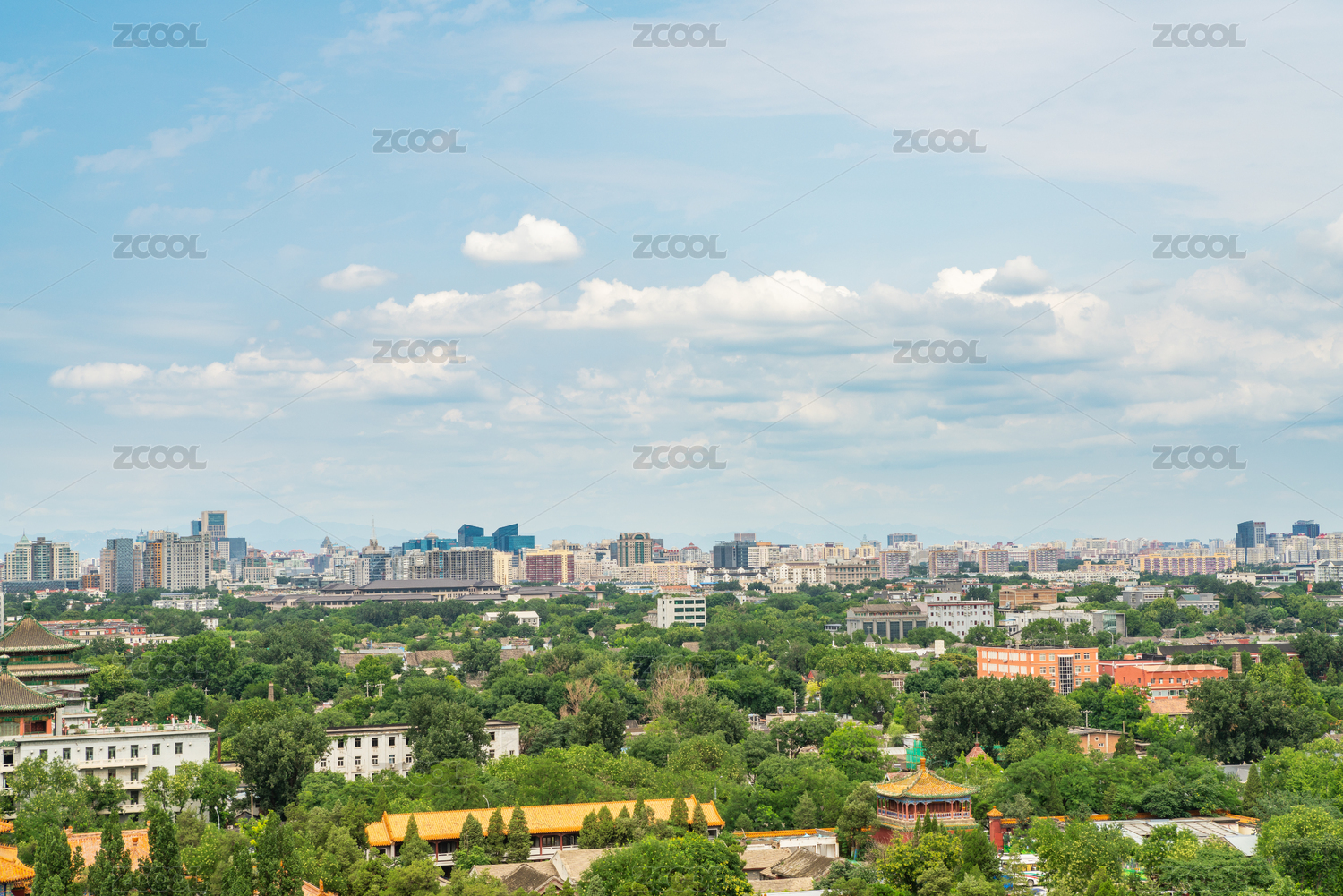 从中国北京景山公园向北看北京中轴线北段:寿皇殿、鼓楼、钟楼、盘古大厦、奥森公园