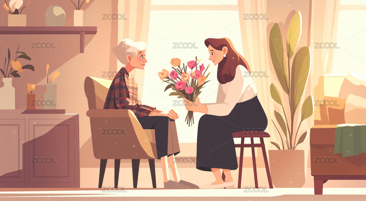 孙女在家中给奶奶端水 可爱风格重阳节孝敬老人插画