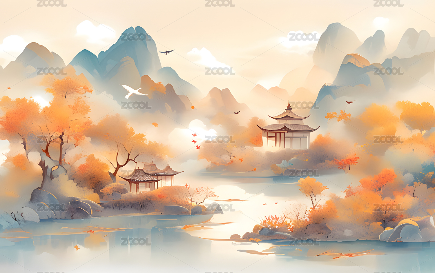秋日水墨山水背景图