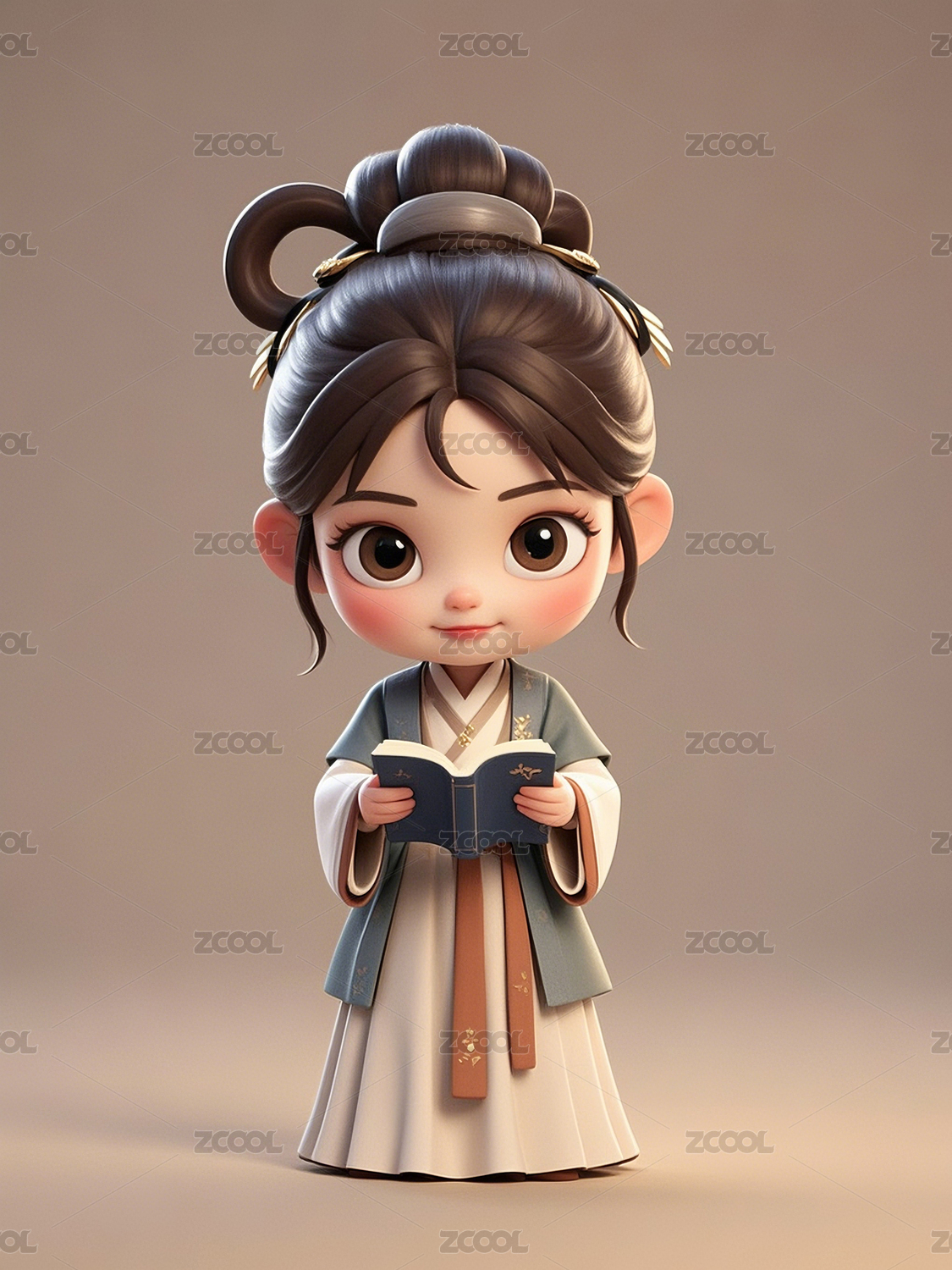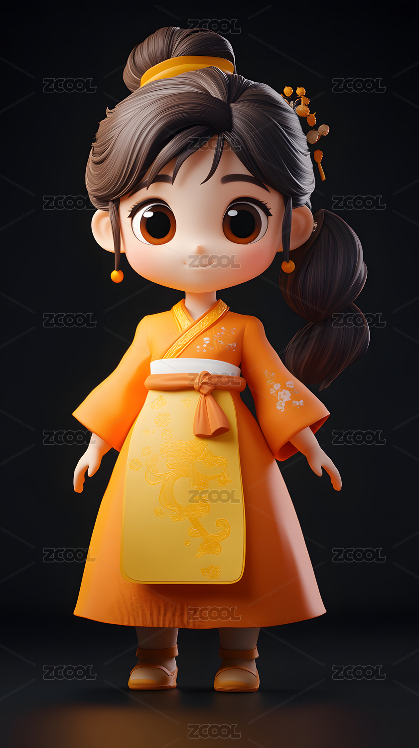人物,IP设计,插画,女孩,汉服,黄色衣服,卡通风格,3D风格