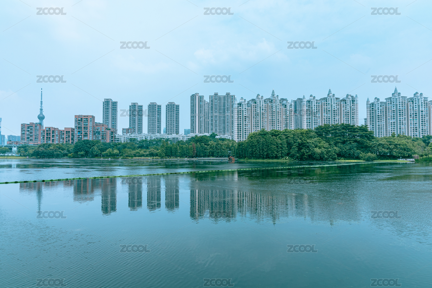 南宁南湖公园蓝天白云与城市摩天大楼建筑