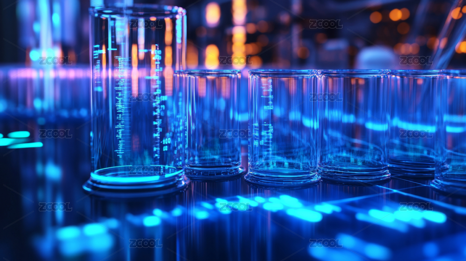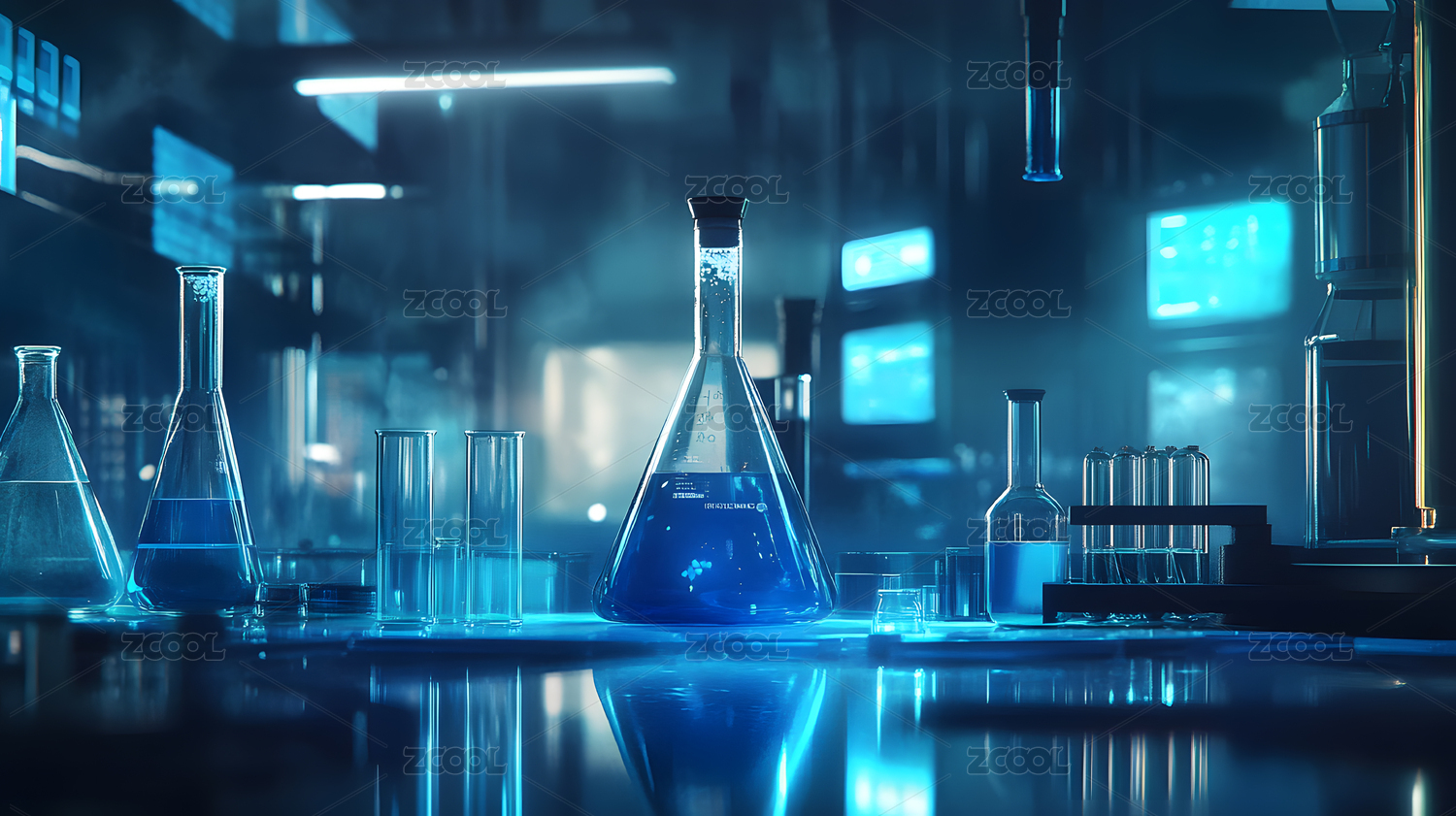 科技感十足的实验室,试管和烧瓶盛放着橙色液体