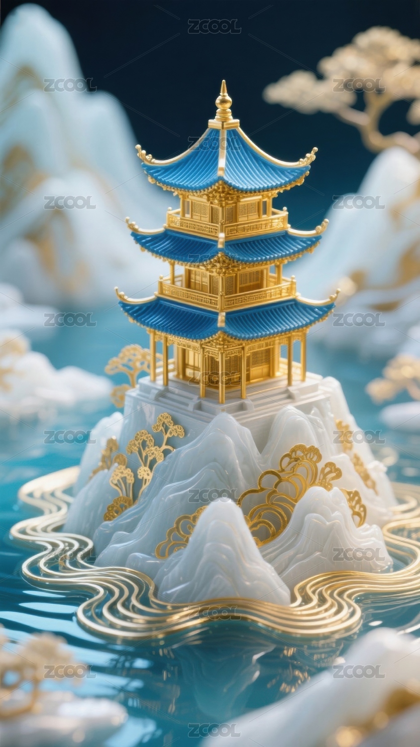 国潮,玉石,风格,雕琢,立体,古建筑,建筑,古代,3D,场景
