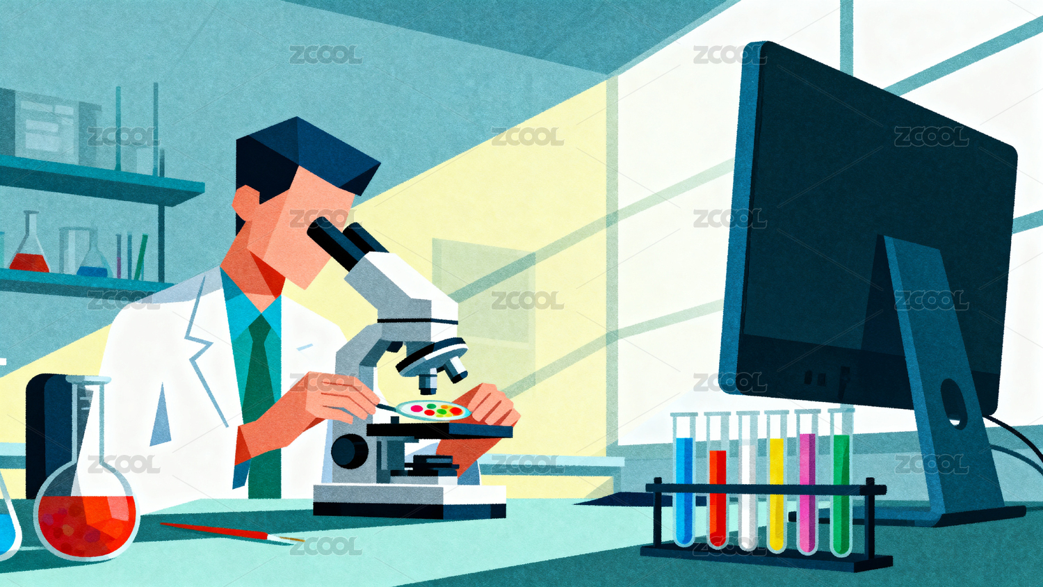 医学科研学者博士使用显微镜做商业实验插画