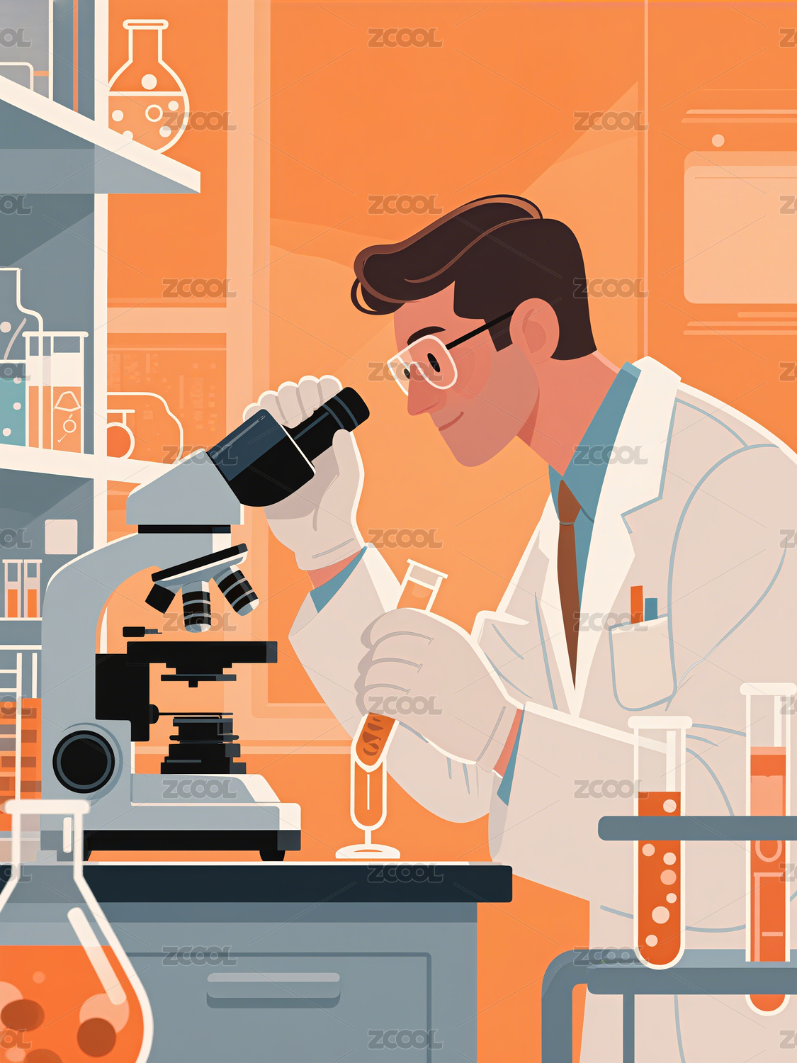 卡通风医疗室内试剂研究橙色插画素材