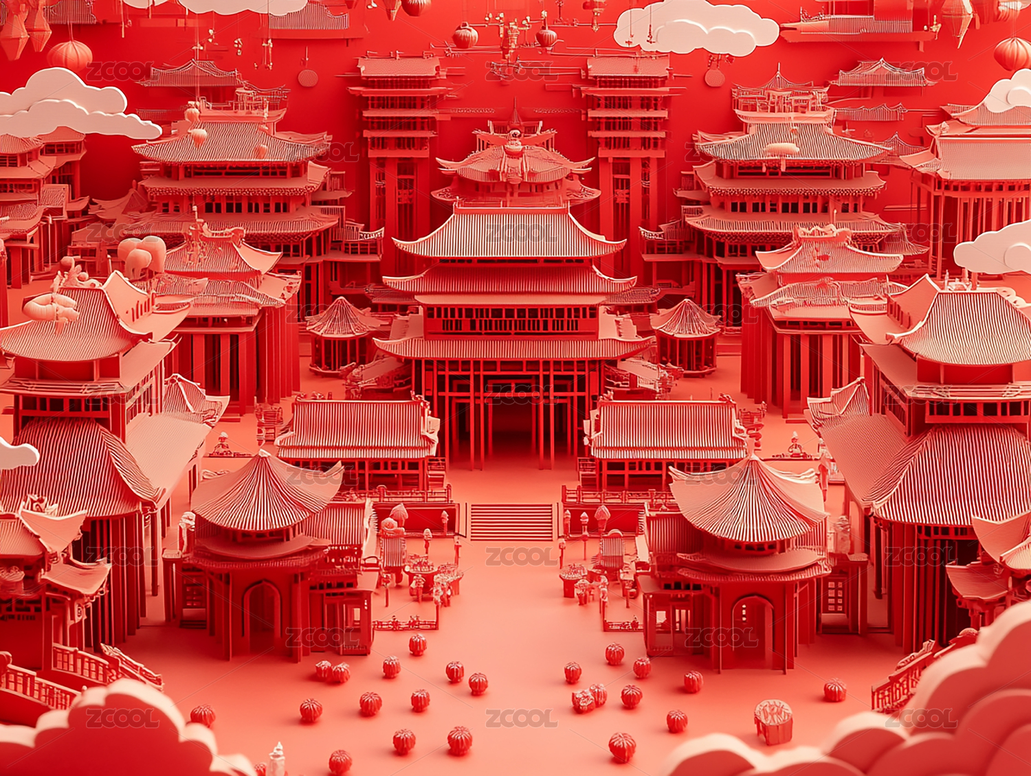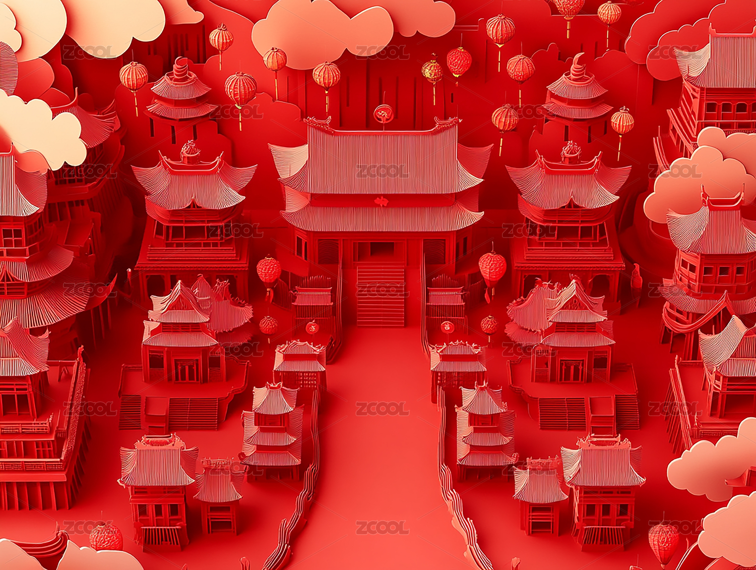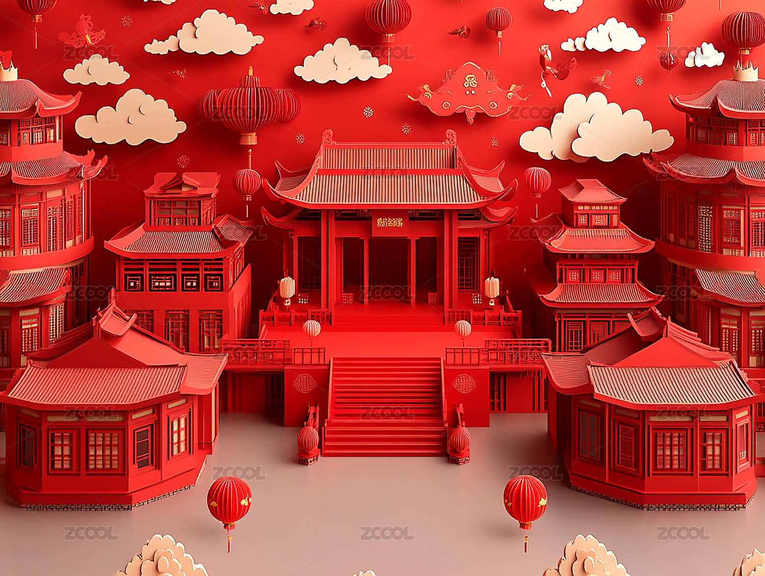 剪纸风中国古建筑红色背景新年春节喜庆庆祝