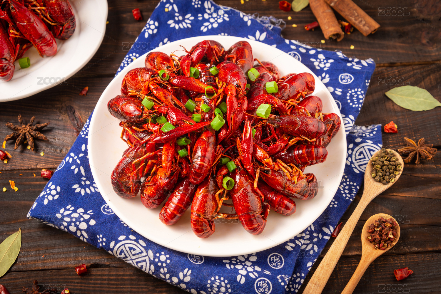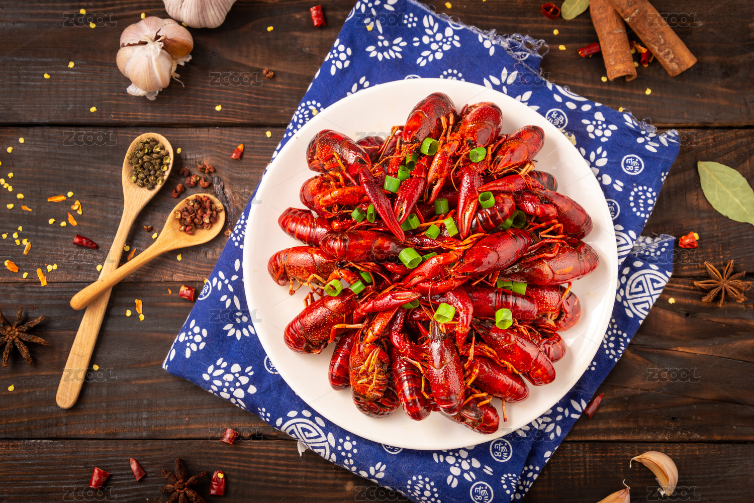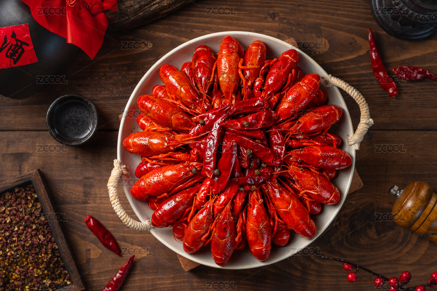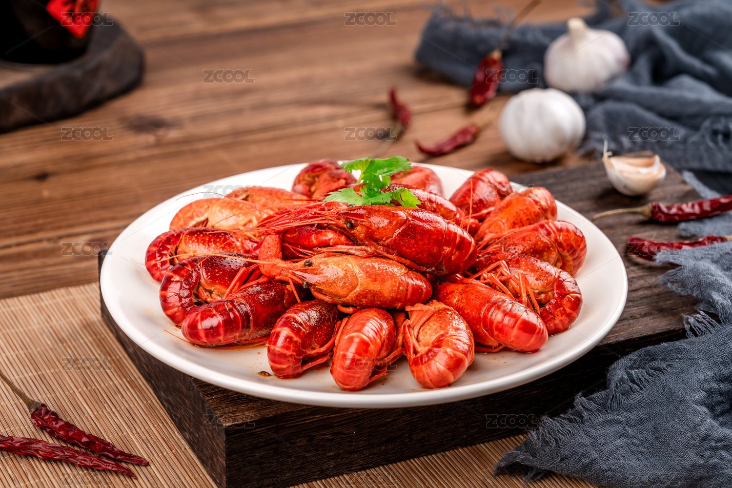 木纹底上的麻辣卤虾