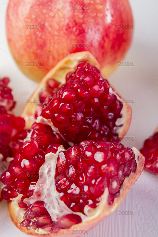 浅色背景下剥开的石榴果肉