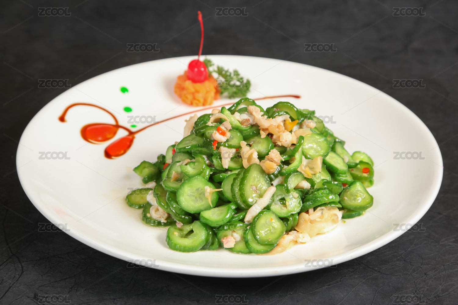 白色圆盘装的酸辣乳瓜摆放在黑色鹅卵石上