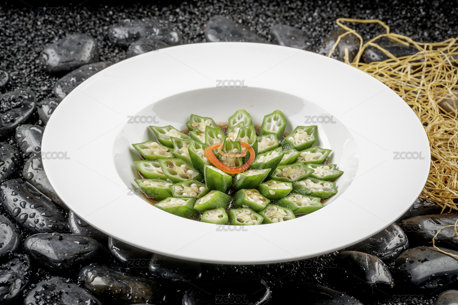 圆形磁盘装的捞汁秋葵摆放在黑色鹅卵石上