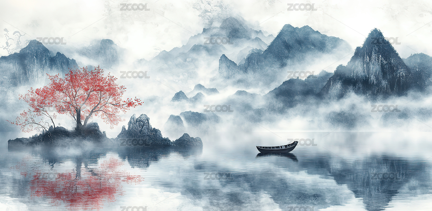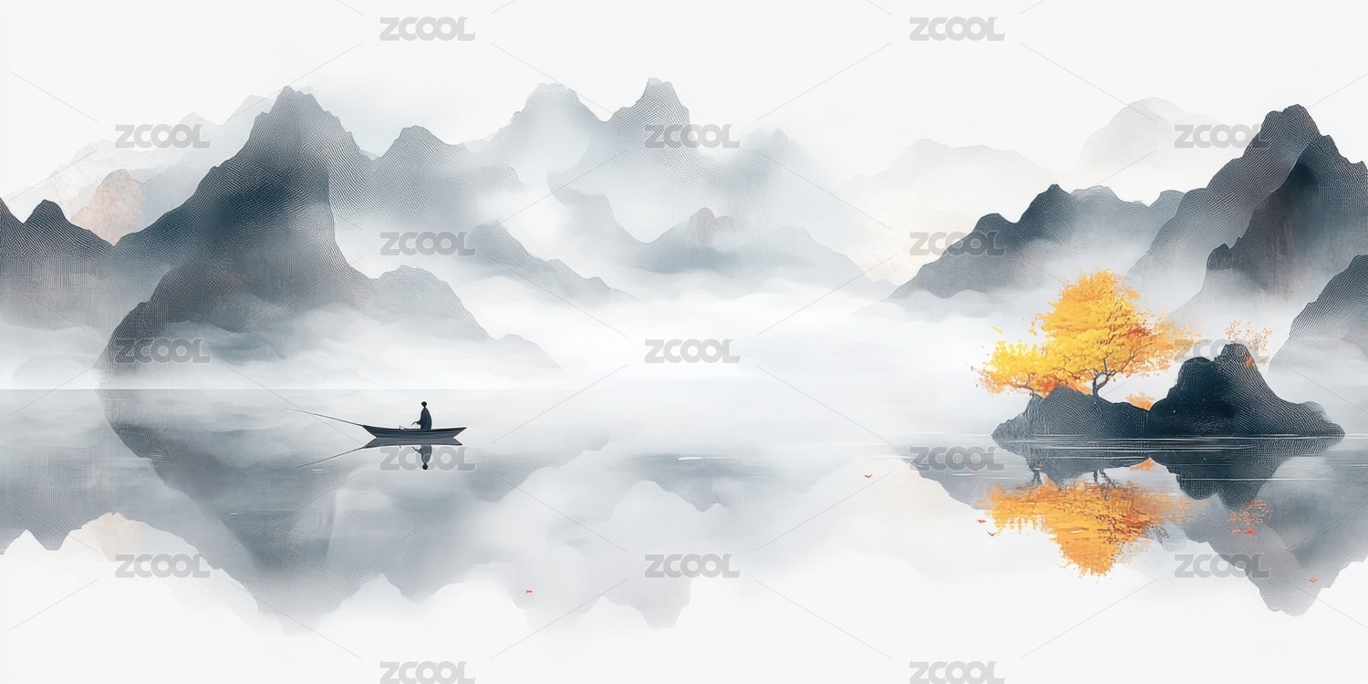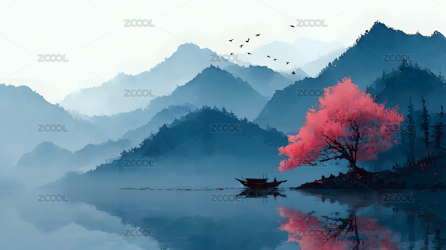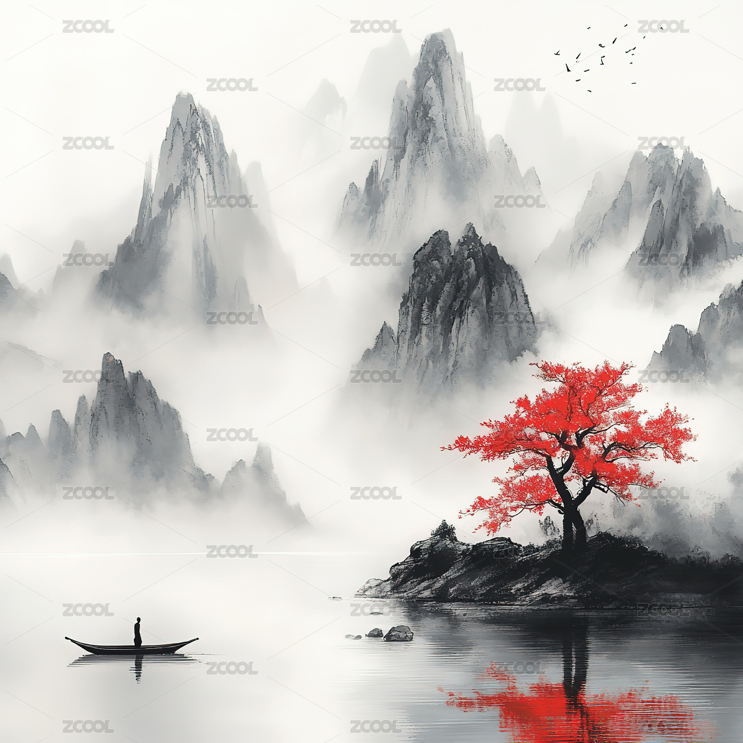 自然,天空,高山,自然美,插画,中国文化,水墨画,无人,云,AI数字艺术
