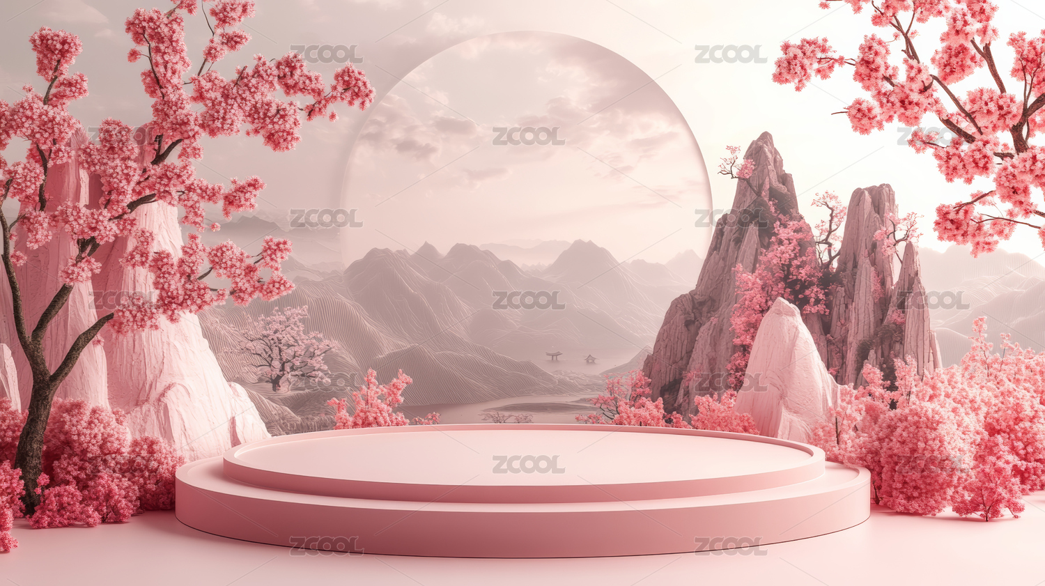 粉色樱花环绕的梦幻展台