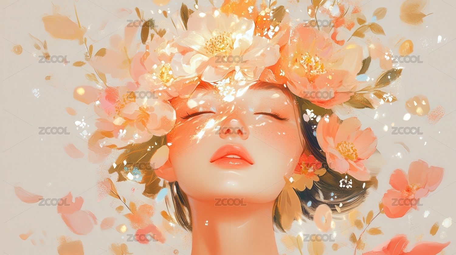 插画风格的头戴鲜花时尚年轻美女模特
