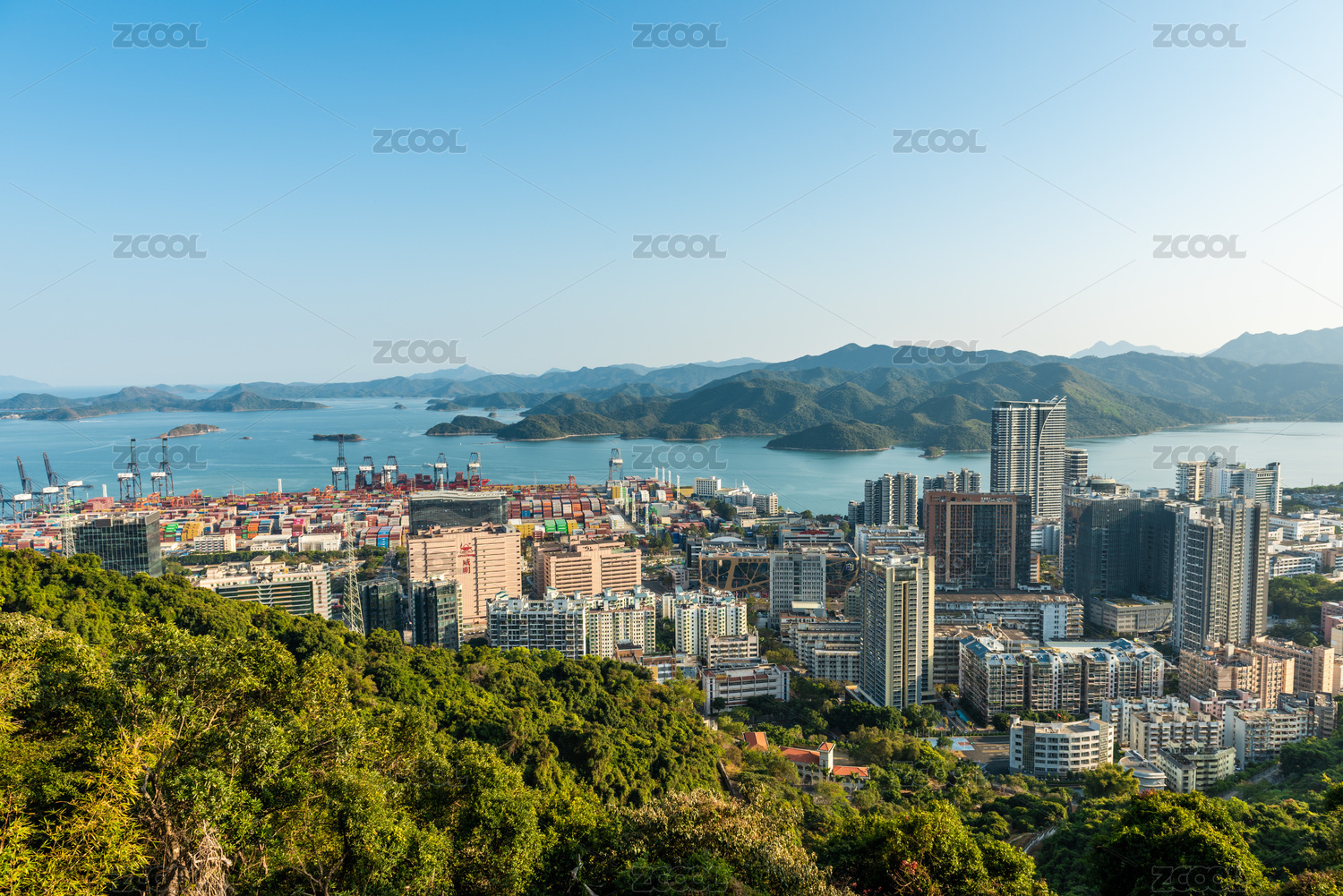 中国深圳,梧桐山脚下的城市建筑群和岛屿