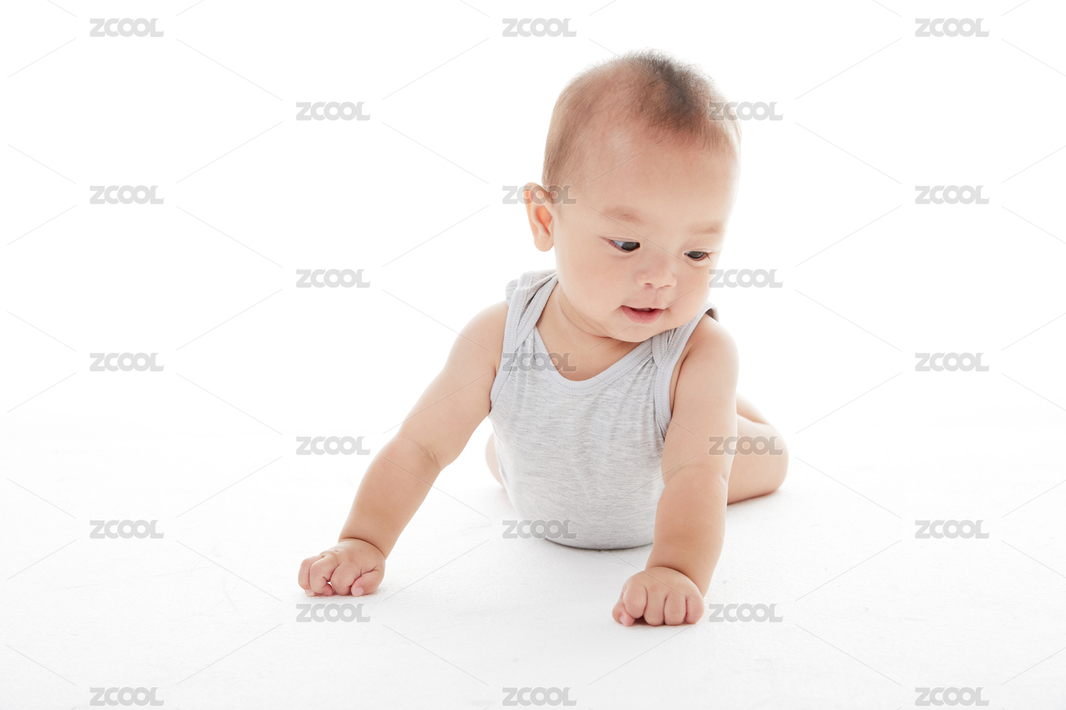 棚拍,宝宝,婴儿,白色背景,水平视角,一个人,亚洲人,百天,趴着,玩耍