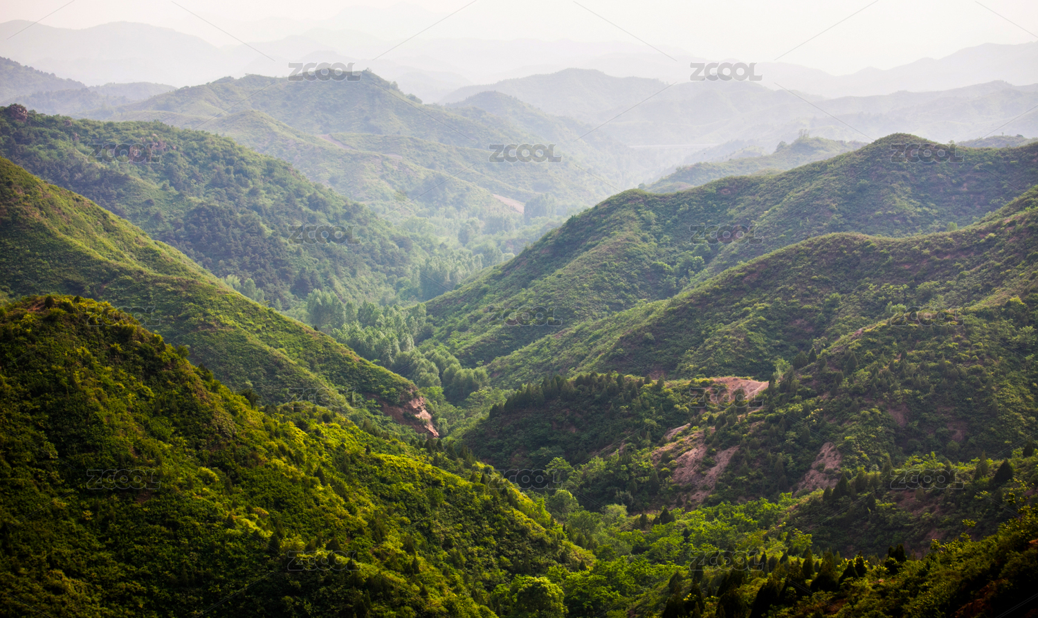 暖色光线中郁郁葱葱的山峰