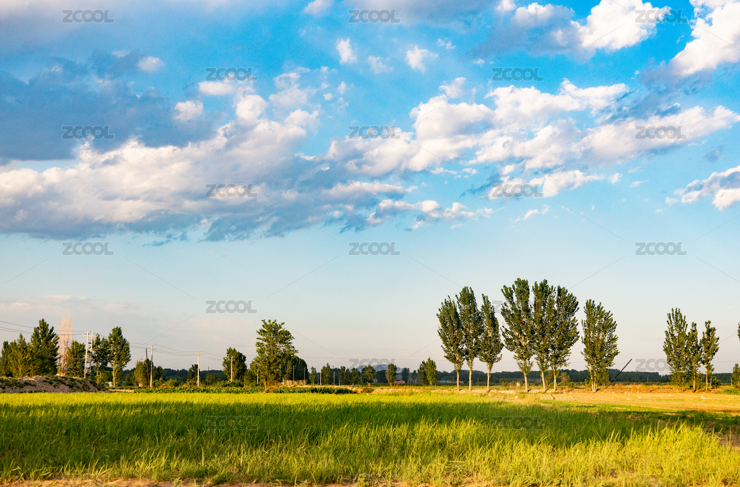 傍晚前蓝天白云下的农田