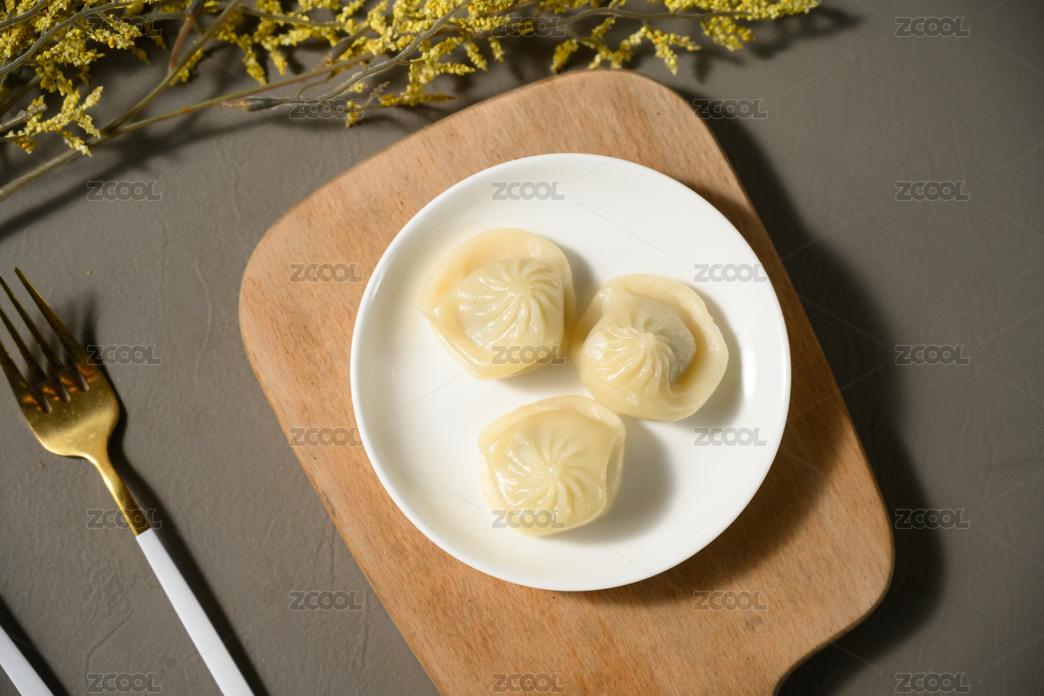 桌面上的盘子里的美味可口的肉煎包