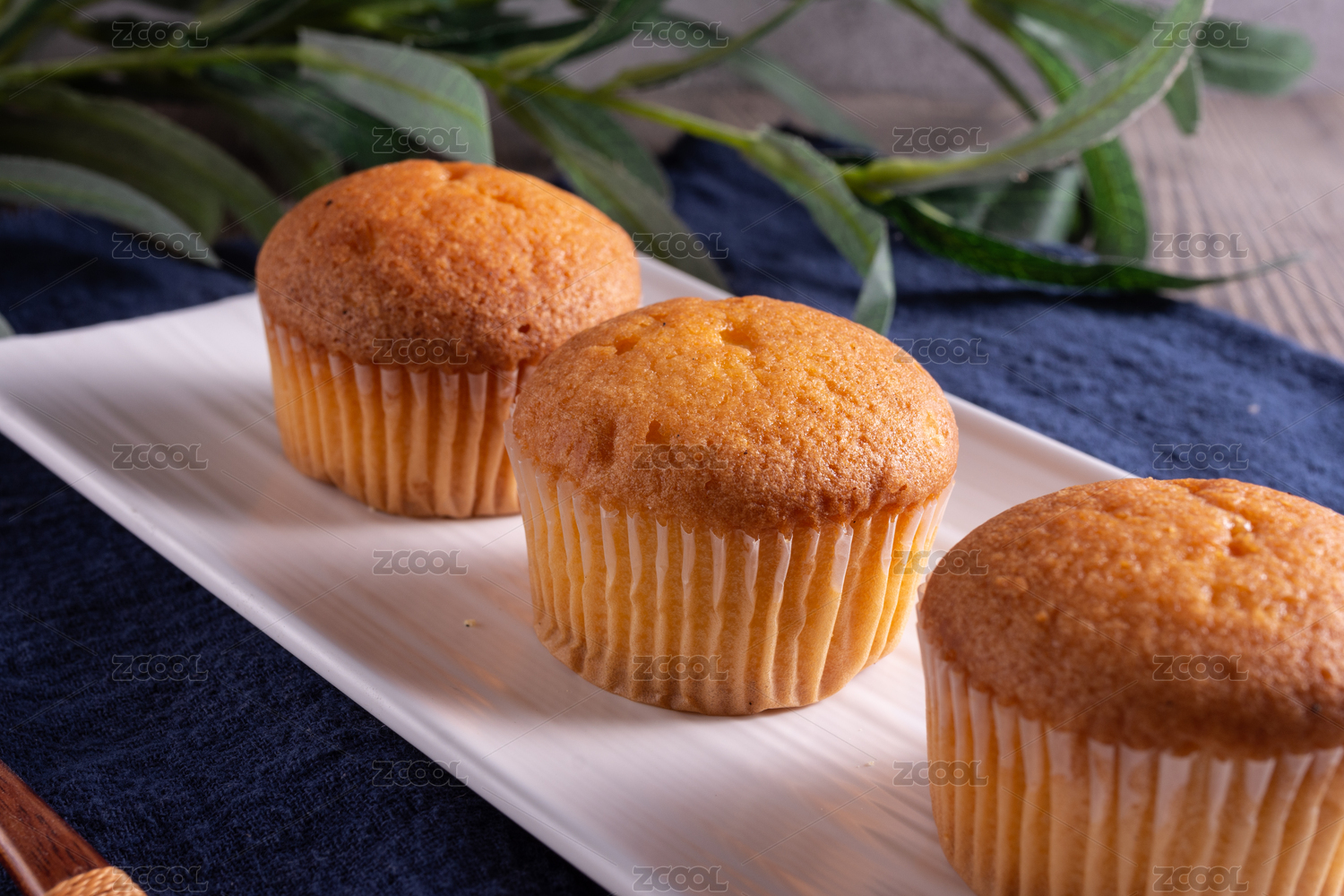 桌面上的白色陶瓷盘子里的纸杯蛋糕