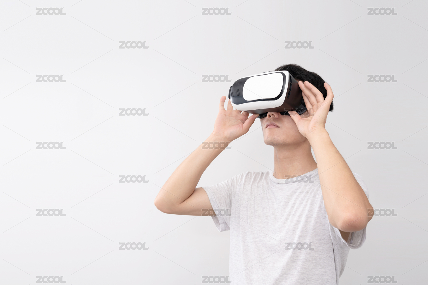 亚洲男士带上VR眼镜,体验虚拟现实技术
