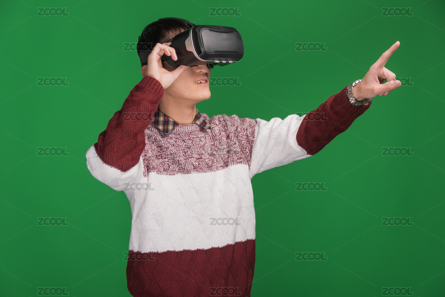 一个亚洲男士带着VR眼镜,向前伸出单手