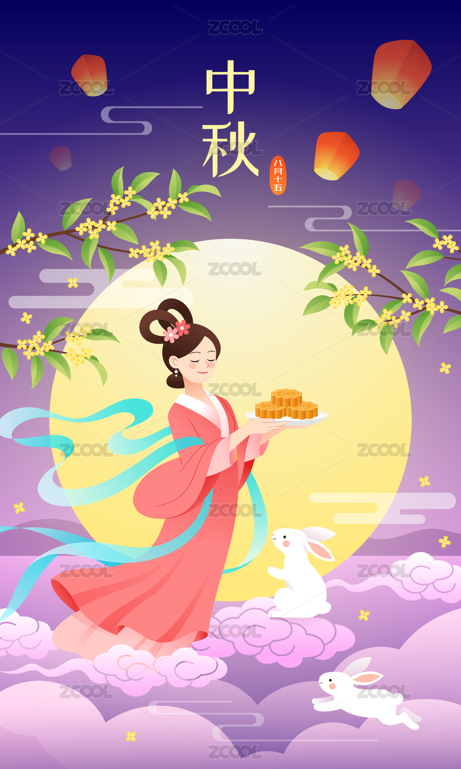 中秋节嫦娥和月亮玉兔荷花等竖版