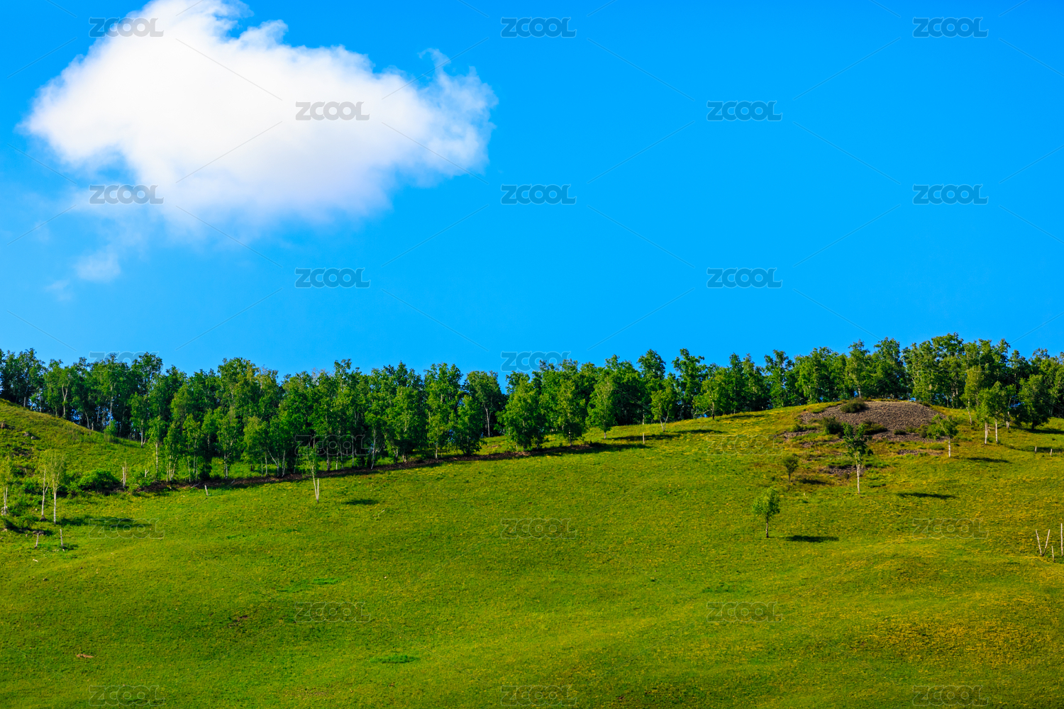蓝天白云的草地小山风景