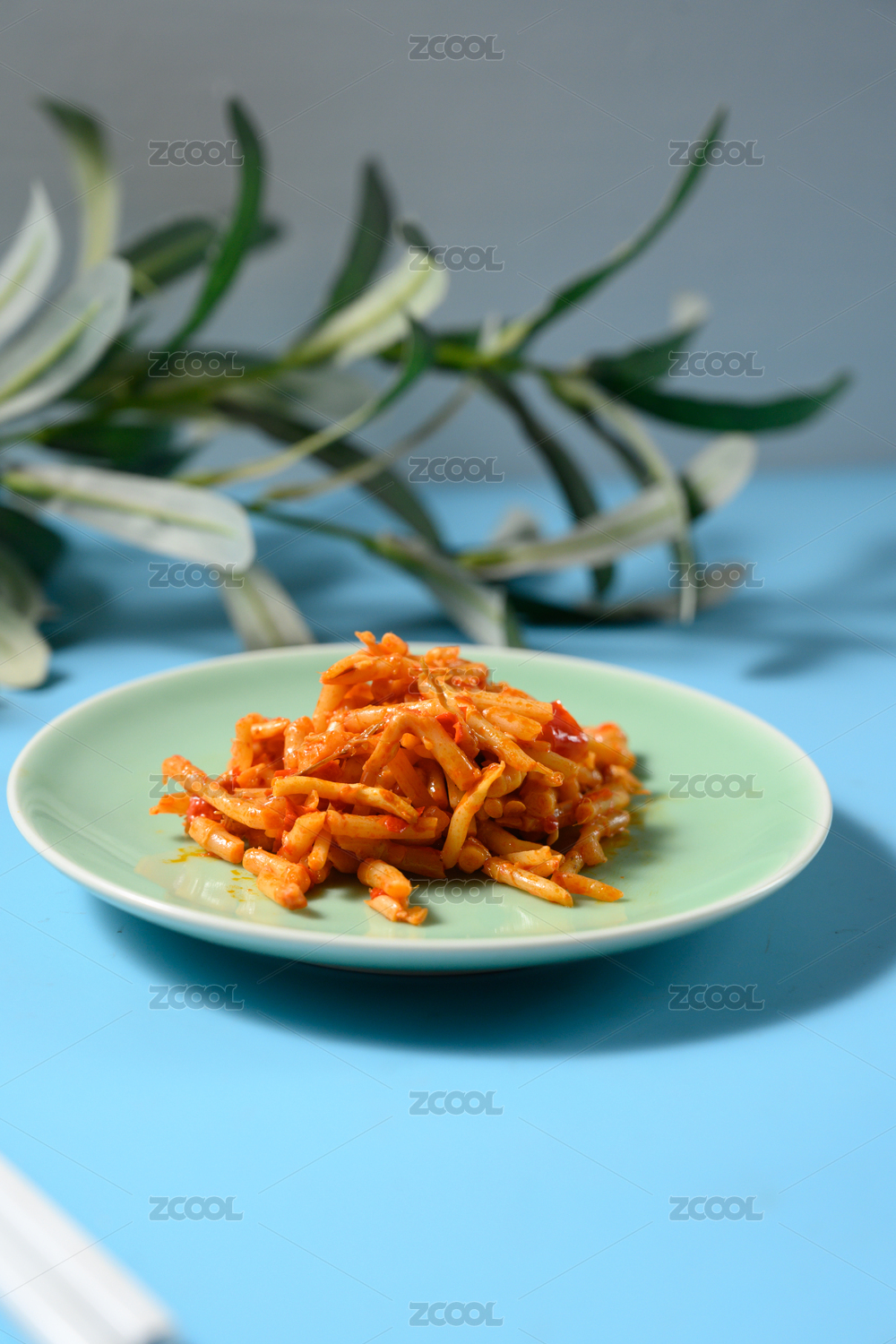 桌面上盘子里的美味可口的麻辣鳗鱼丝