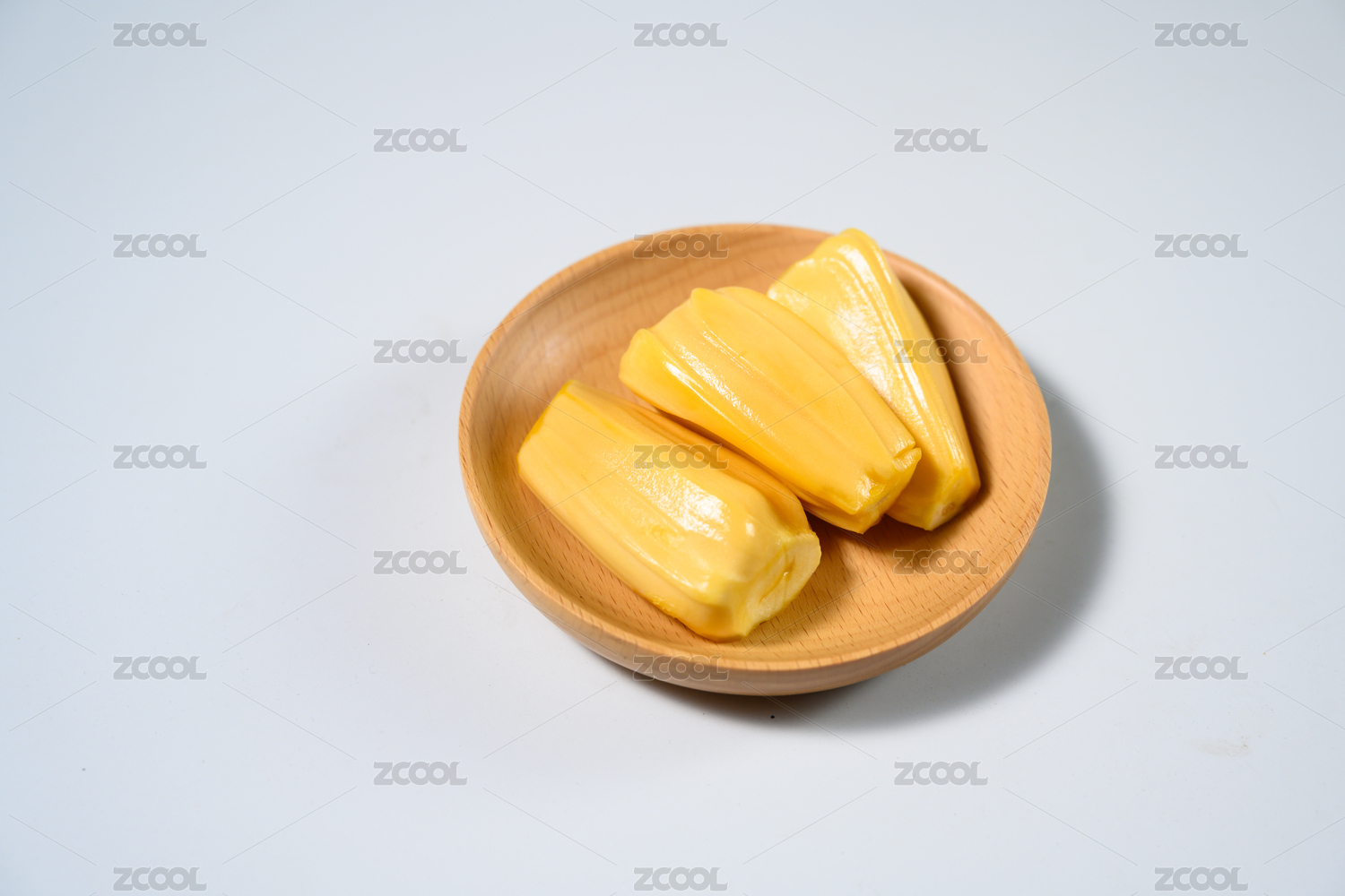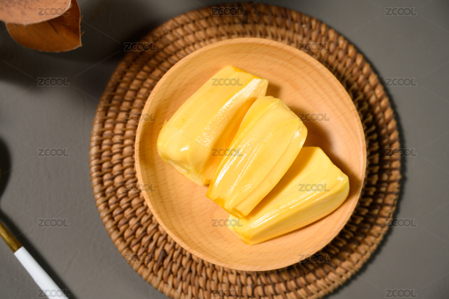 桌面上的玻璃盘子里的美味可口的菠萝蜜
