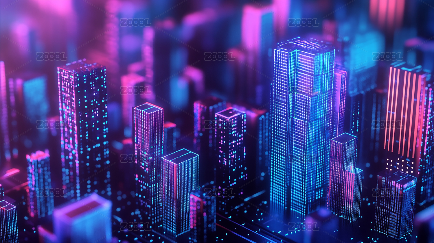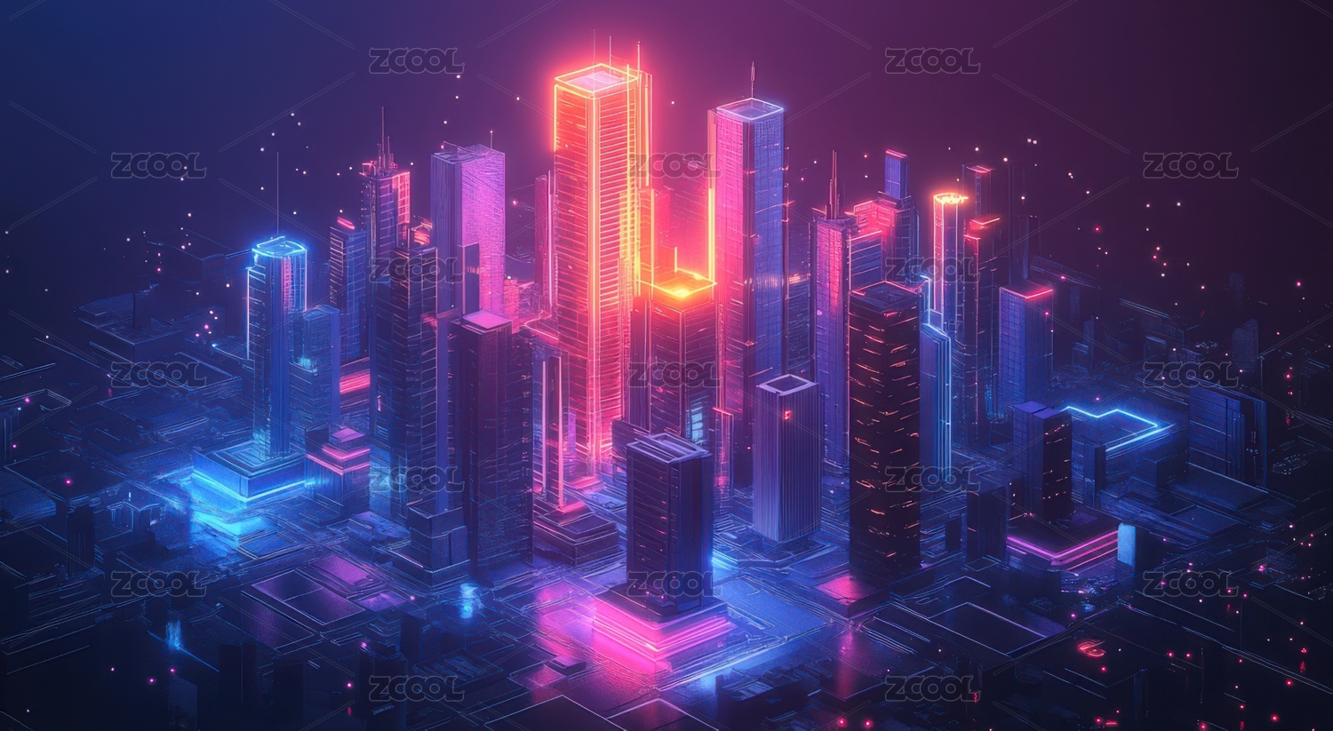 梦幻荧光色城市建筑赛博3D卡通立体插画