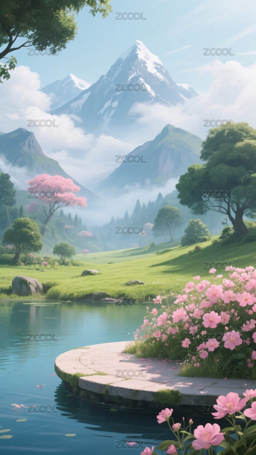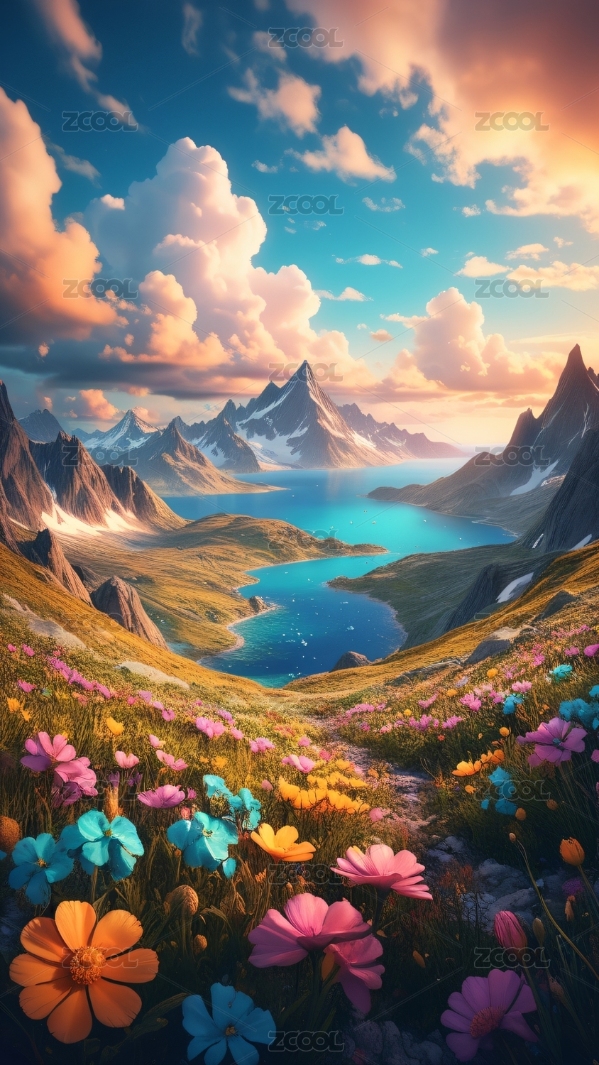 雪山溪流与花田