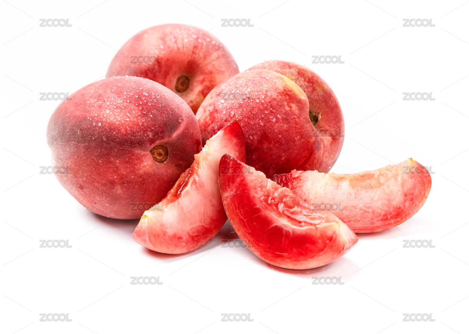 白底上放着一堆春雪水蜜桃和水蜜桃果肉