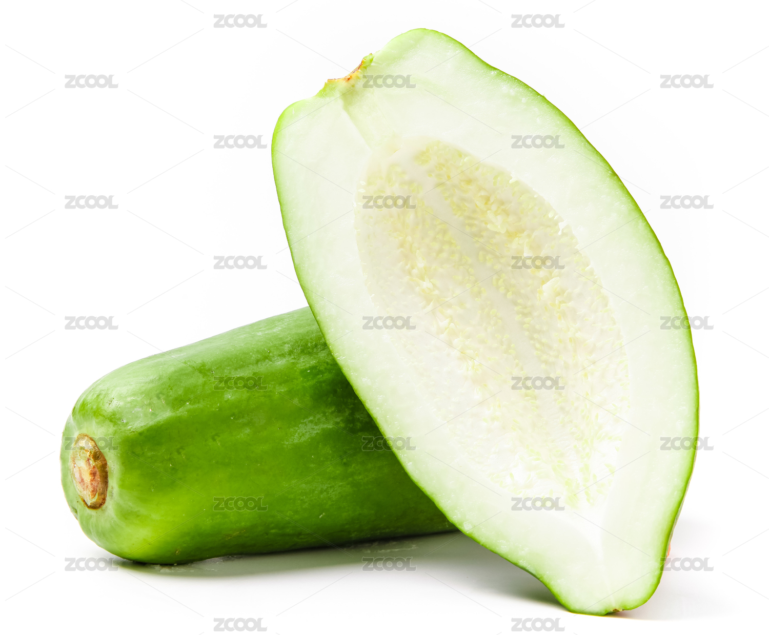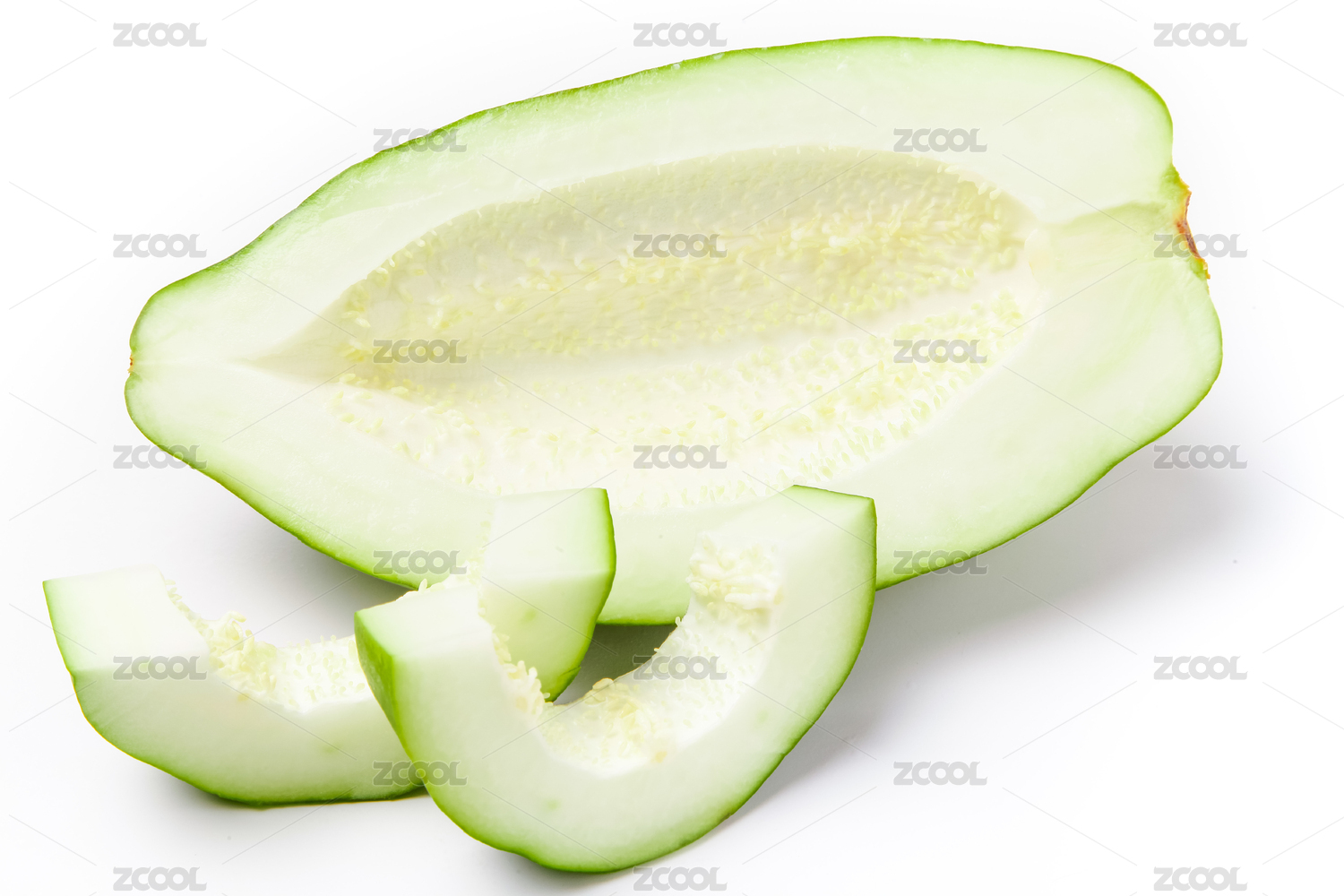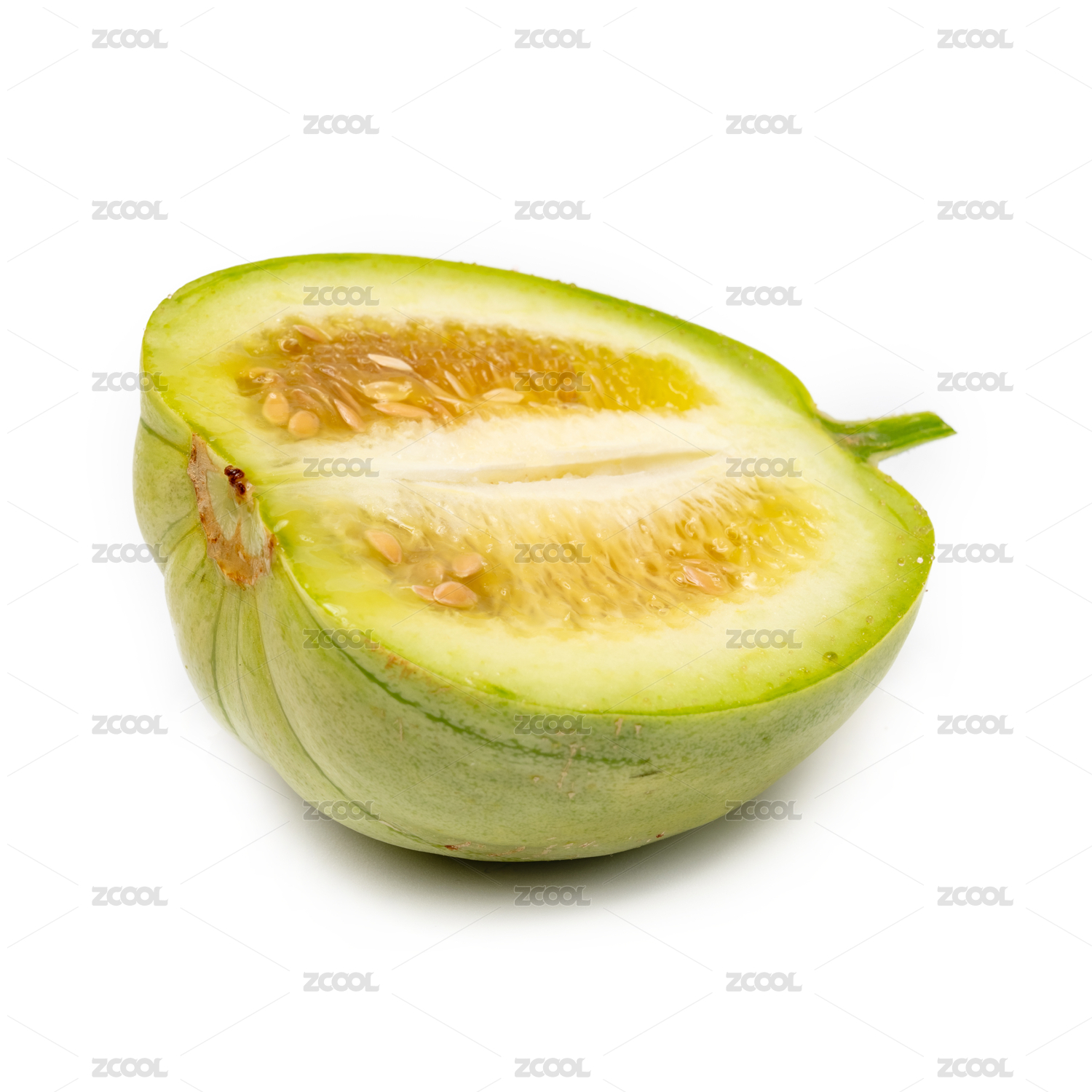 白底上的一个完整青木瓜和两块切开的青木瓜块