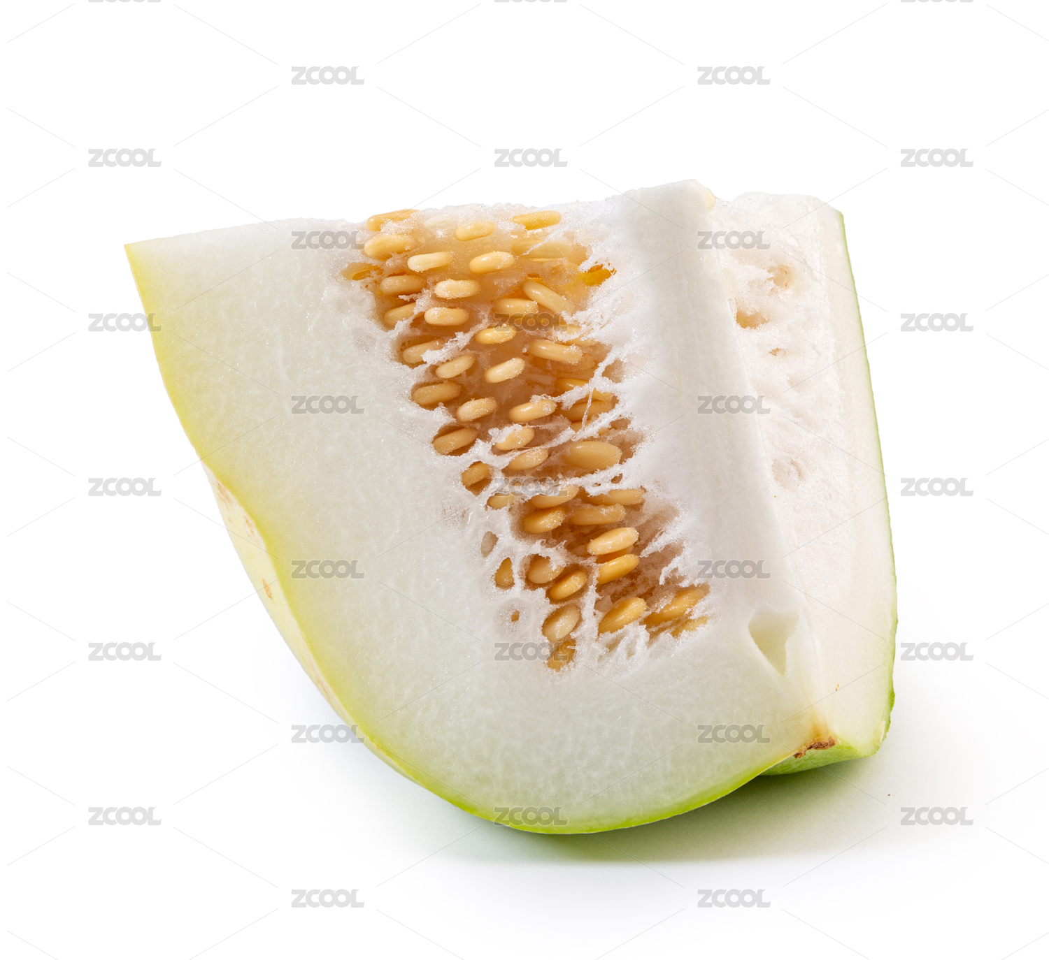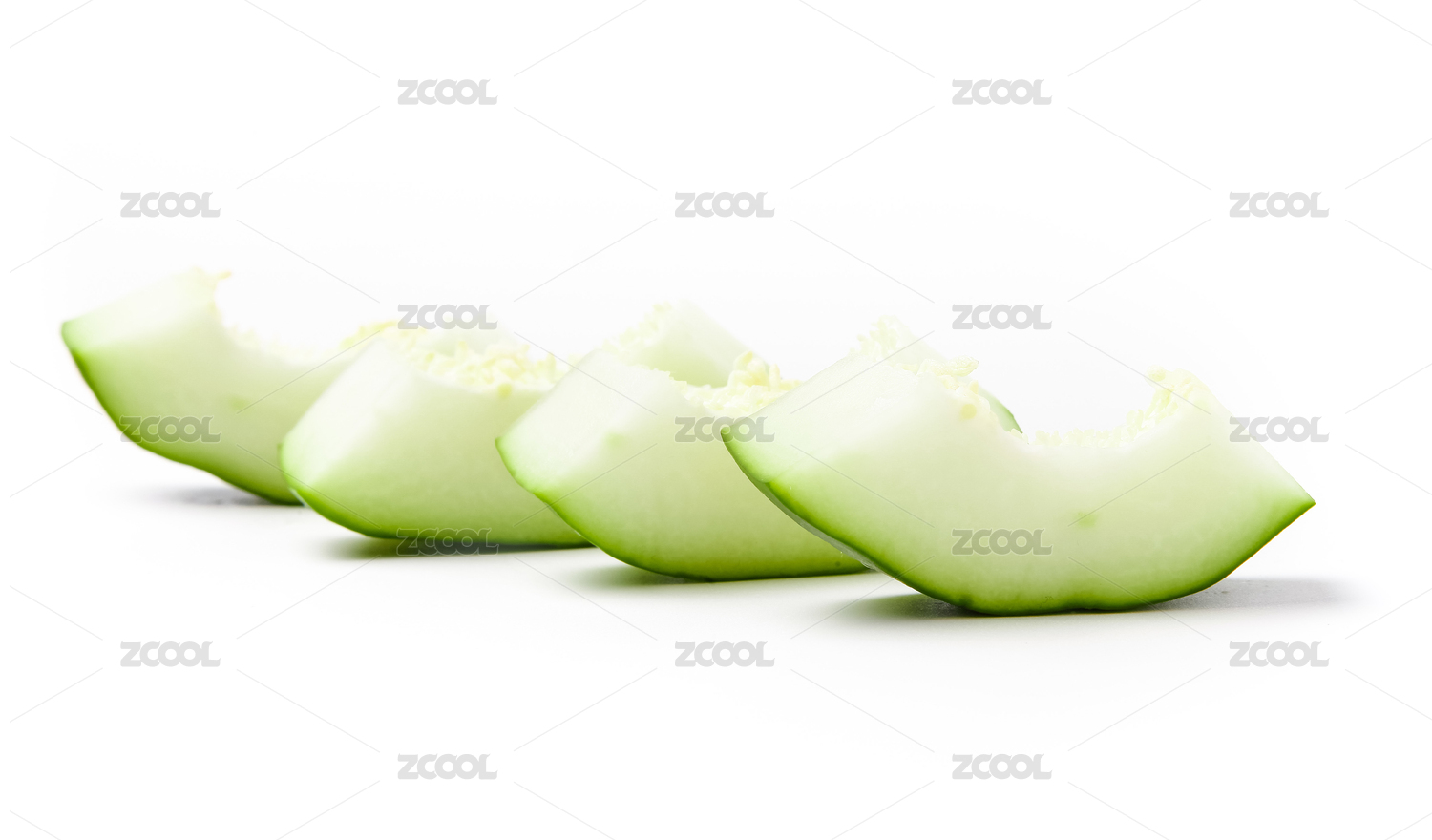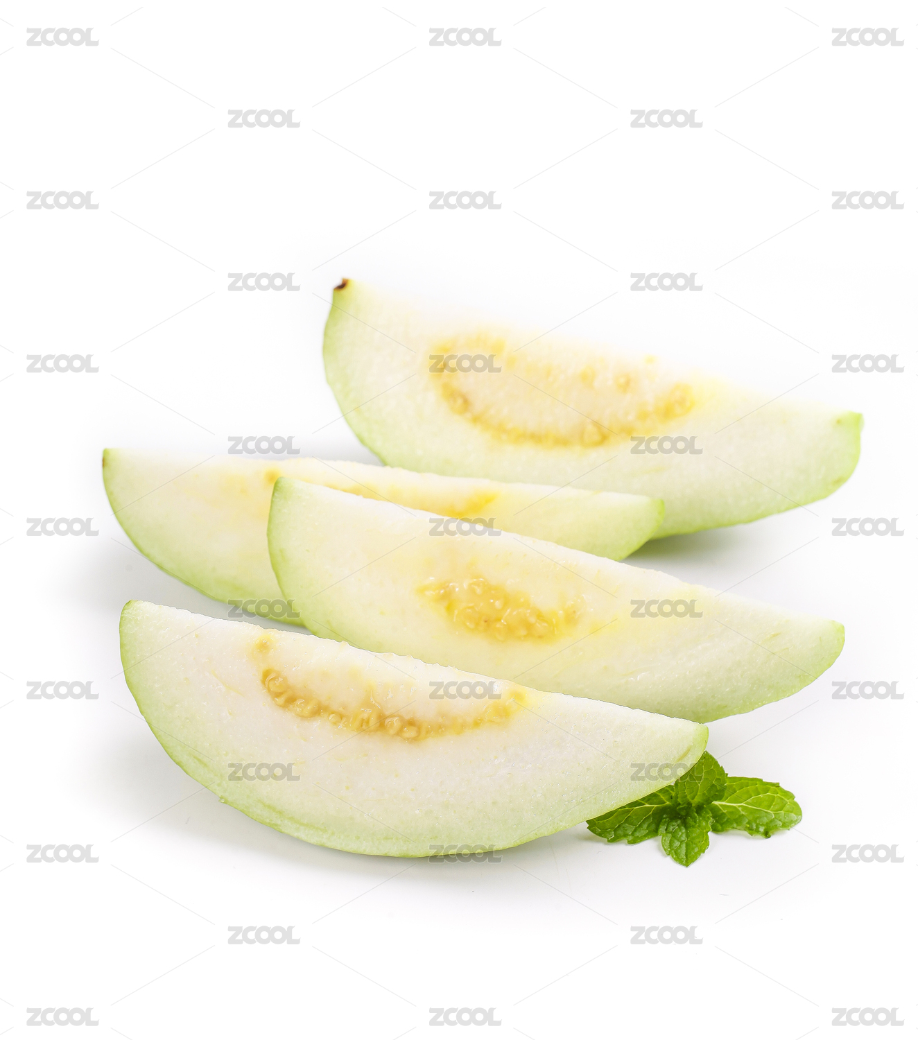 白底上的一个完整青木瓜和两块切开的青木瓜块