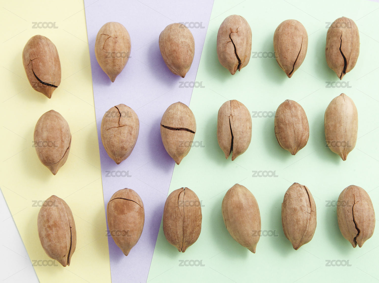 三色彩底上放着薄壳碧根果和碧根果果仁