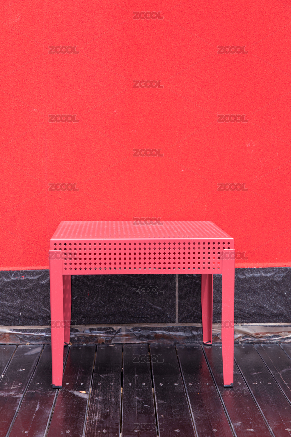 一个红色的金属桌子放在红色墙面前