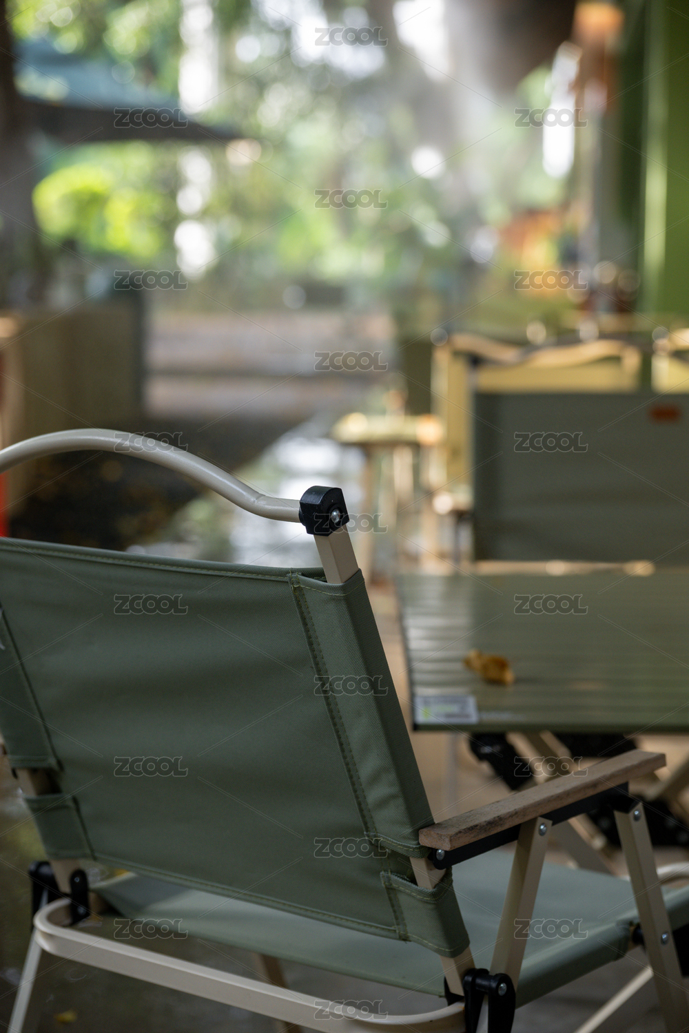 高角度拍摄的绿色餐桌餐椅在室外餐厅背景中