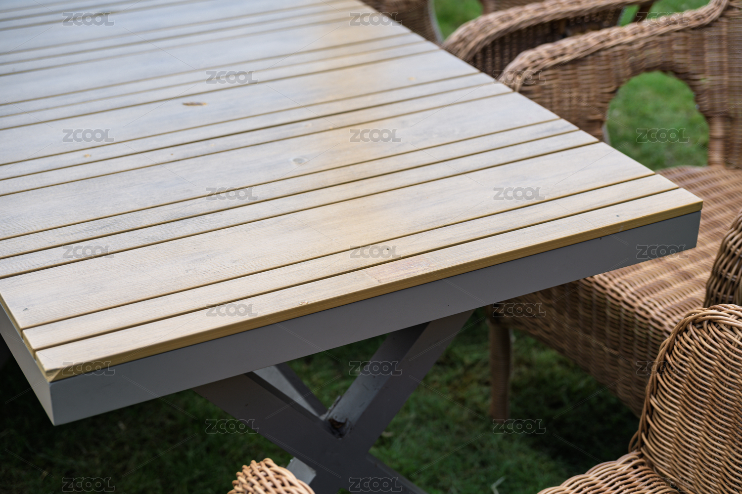 户外藤编家具与木质餐桌的庭院场景