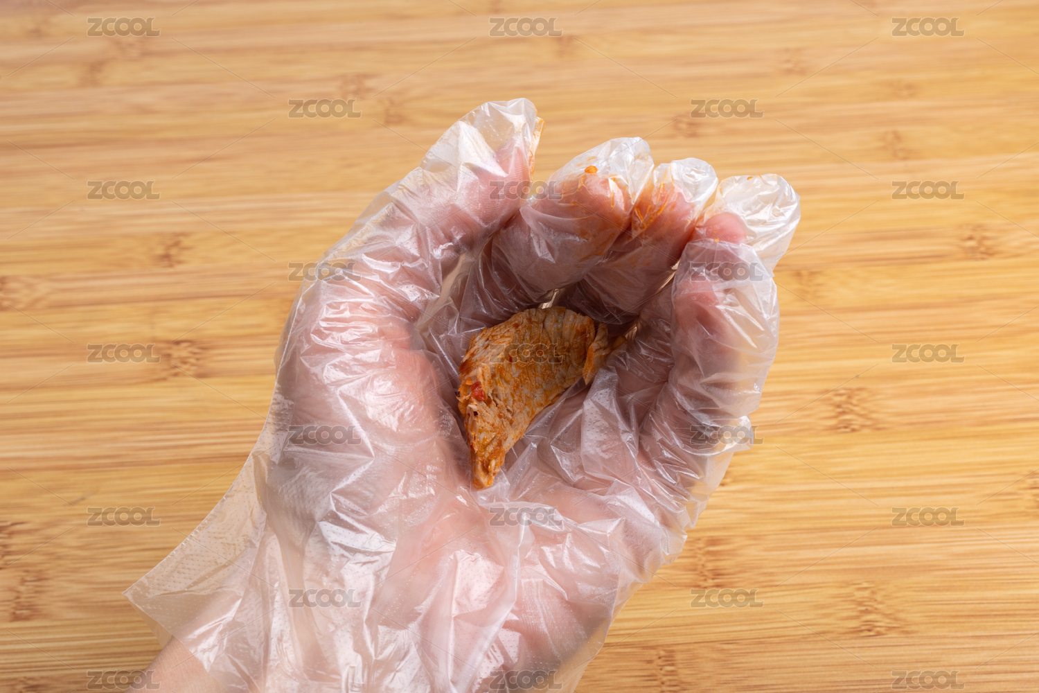 手戴一次性聚乙烯材料食品手套抓瘦肉食物