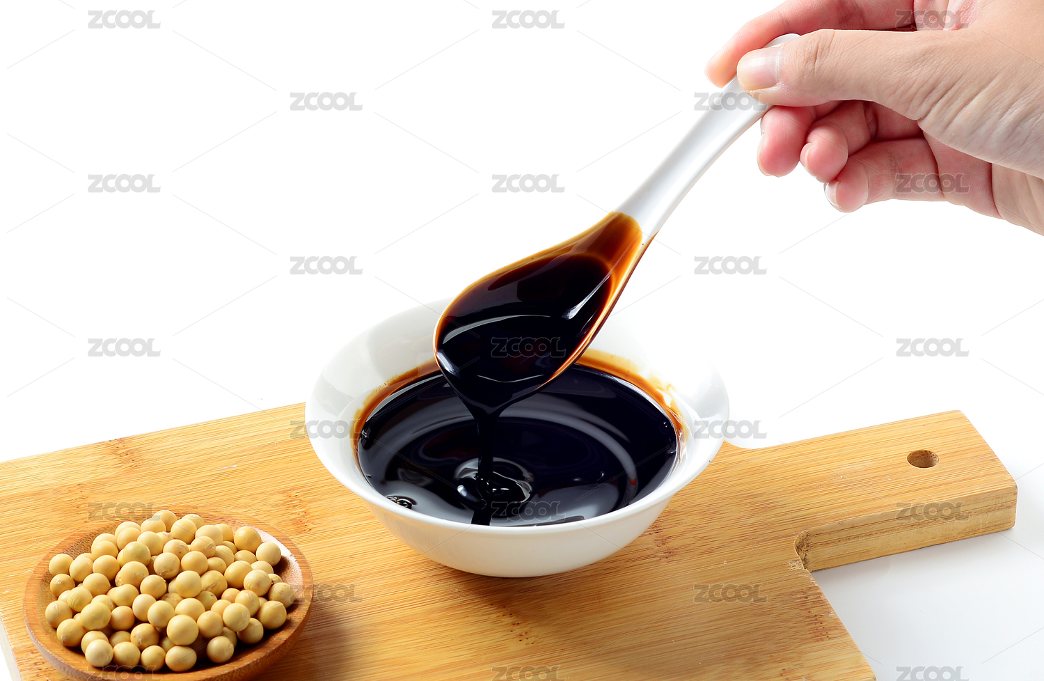 深底麻垫上放着一碗调味酱油和勺子上挖酱油