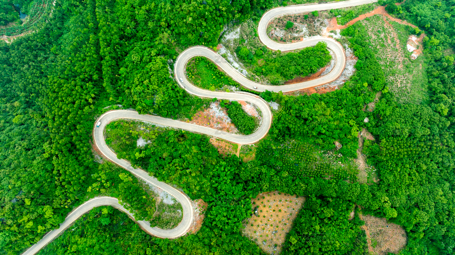 汽车行驶在竹林竹海蜿蜒的盘山公路上